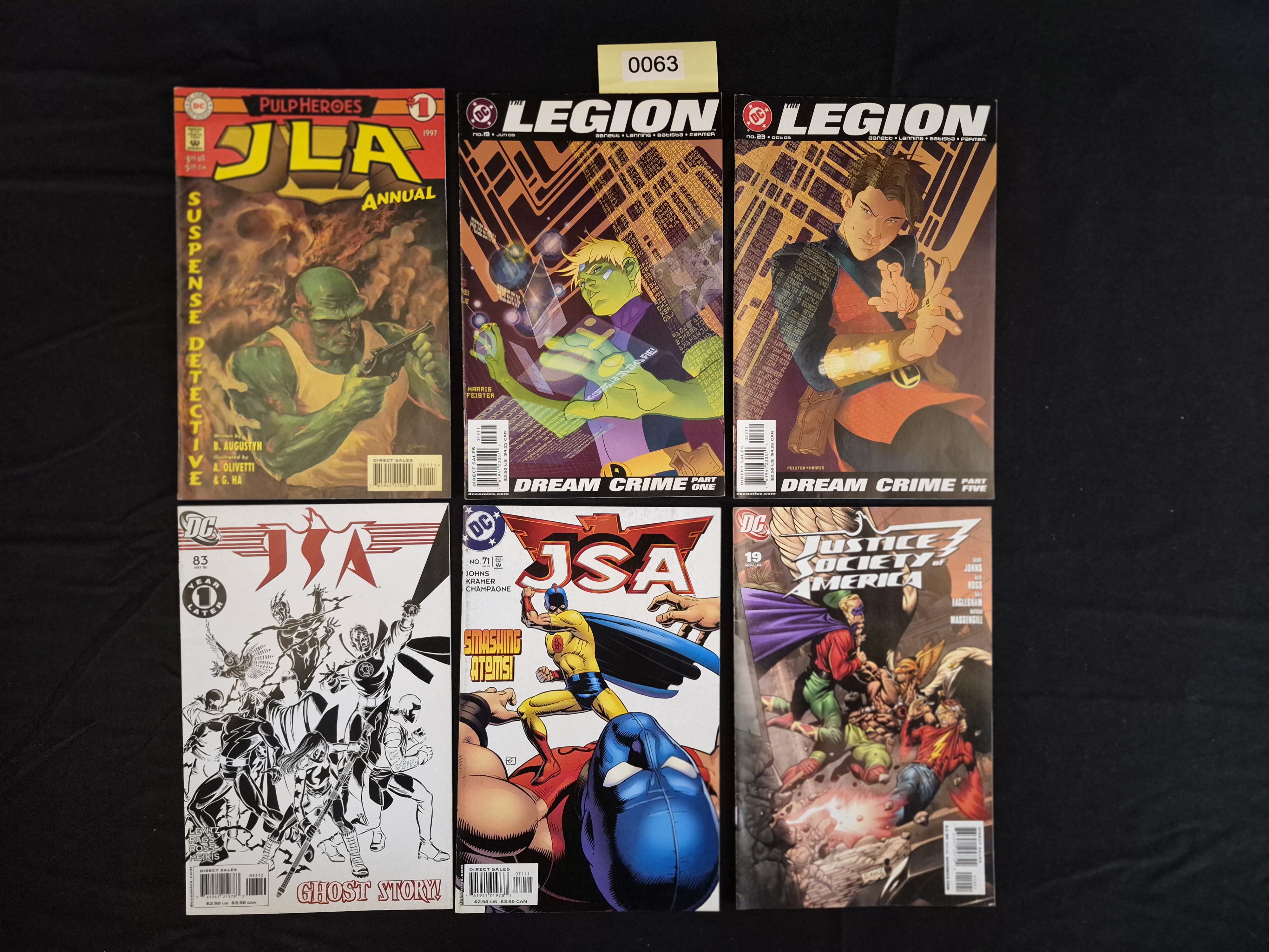 BID PER WHAT YOU SEE IN THE PHOTO, NOT THE AI GENERATED TITLES AND DESCRIPTIONS! A collection of six Modern Age comic books published by DC Comics, focusing on the Justice League of America (JLA) and Justice Society of America (JSA) franchises. The collection spans the years 1997 through 2008. The items are saddle-stitched paper periodicals. Specific titles include JLA Annual #1 (1997), The Legion issues #19 and #23 (2003), JSA issues #71 (2005) and #83 (2006), and Justice Society of America #19 (2008). JSA #83 features a distinctive black and white cover design. An inventory sticker marked 0063 is adhered to the background above the center items.
