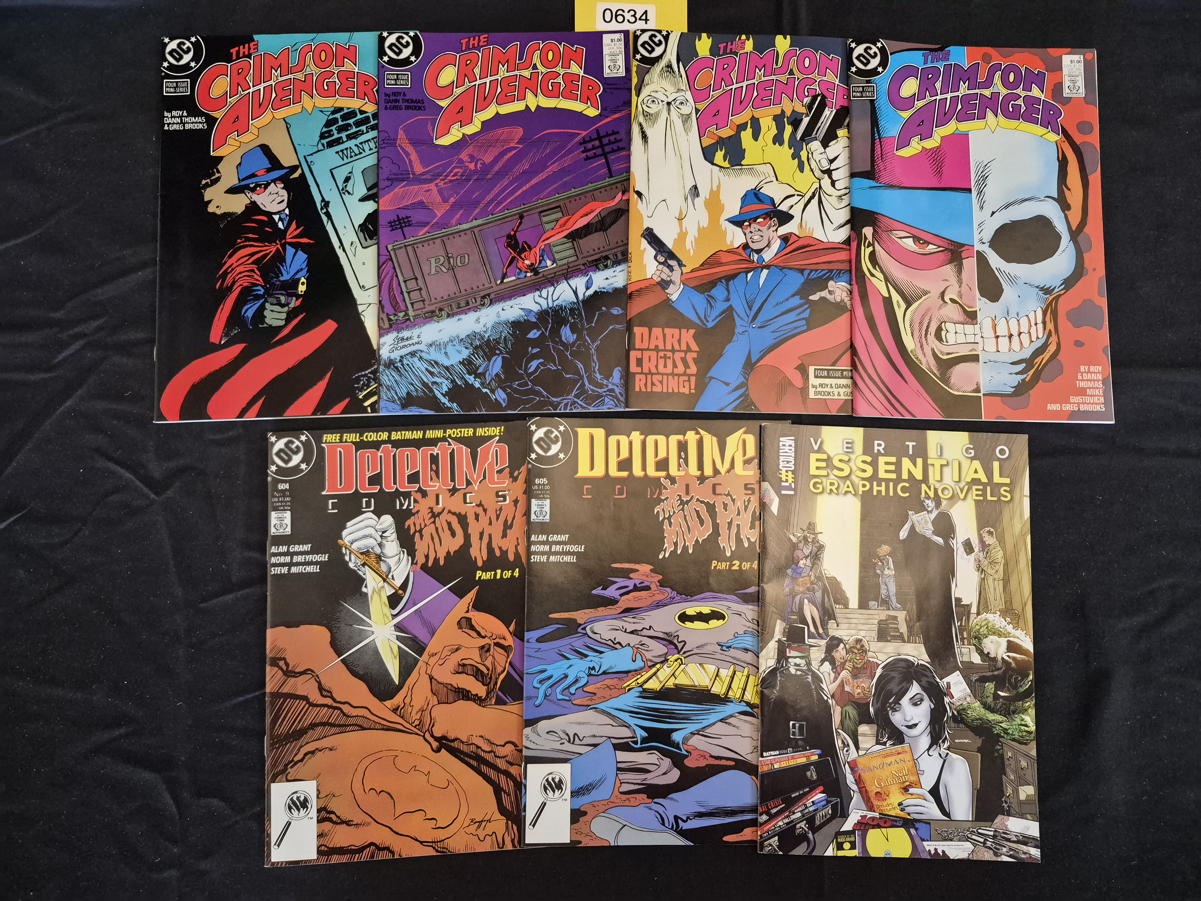 BID PER WHAT YOU SEE IN THE PHOTO, NOT THE AI GENERATED TITLES AND DESCRIPTIONS! A collection of nine comic book periodicals published by DC Comics, dating primarily from the late 1980s and early 1990s Modern Age of comics. The lot includes the complete four-issue mini-series run of *The Crimson Avenger* (1988, by Roy & Dann Thomas and Greg Brooks). The remaining five items include sequential issues of *Detective Comics*, specifically No. 604 (The Mud Pack Part 1 of 4) and No. 605 (The Mud Pack Part 2 of 4), featuring work by Alan Grant, Norm Breyfogle, and Steve Mitchell. The collection also includes a third unnumbered *Detective Comics* title related to the same storyline, and one promotional issue titled *Vertigo Essential Graphic Novels* No. 1. All items feature vibrant color cover illustrations and the DC Comics logo in the corner boxes.