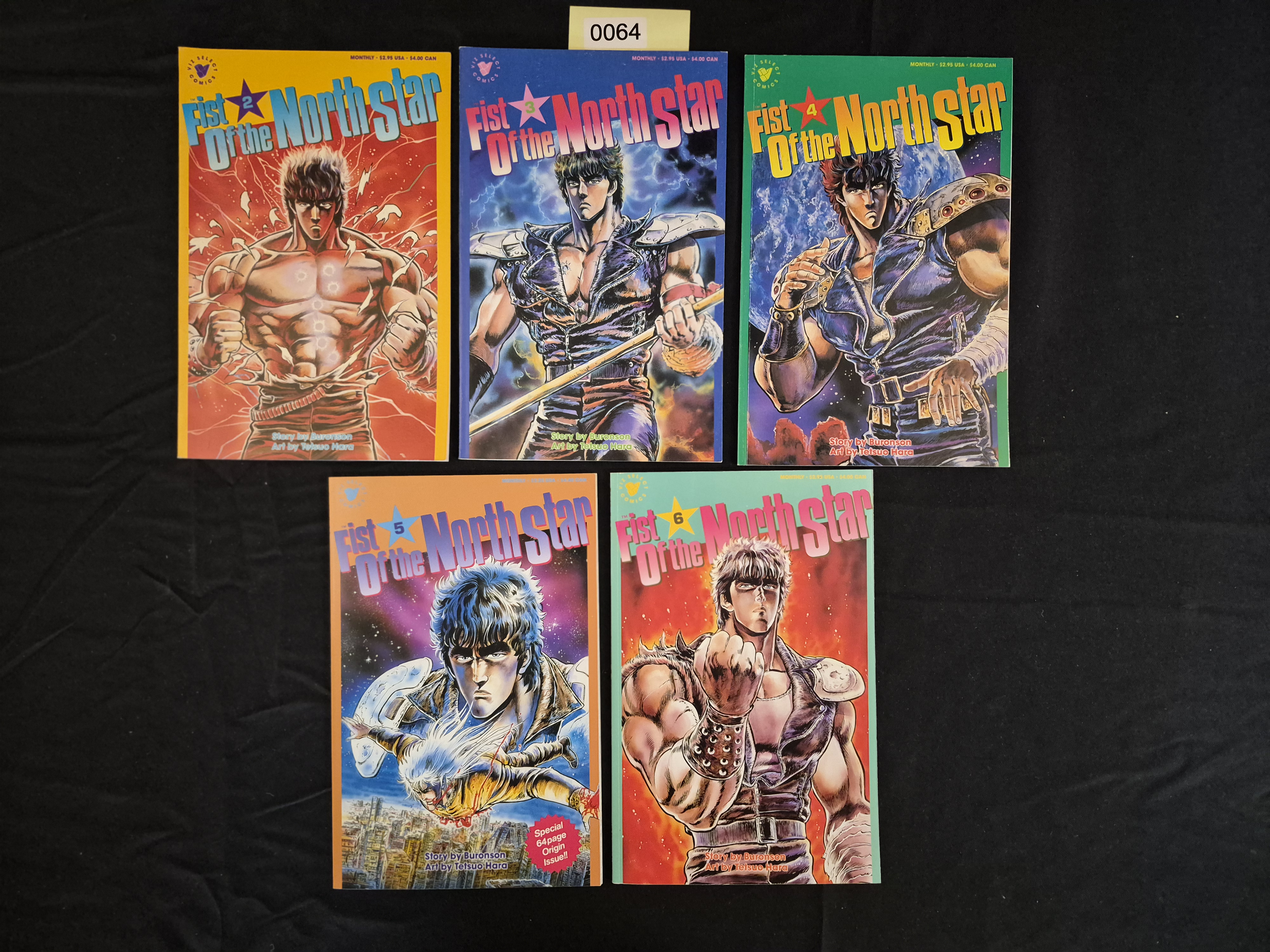 BID PER WHAT YOU SEE IN THE PHOTO, NOT THE AI GENERATED TITLES AND DESCRIPTIONS! A collection of five US-format paperback comic books from the series Fist of the North Star, published under the Viz Select Comics imprint. The lot includes issues 2, 3, 4, 5, and 6. The creative credits are listed as Story by Buronson and Art by Tetsuo Hara. The covers feature full-color, stylized illustrations of the protagonist, Kenshiro, set against differing vibrant backgrounds (yellow, blue, green, orange, and red). Issue 5 is specifically marked with a red stamp noting it as a Special 64 page Origin Issue!!. Standard publishing details are visible, including a cover price of $2.95 USA / $4.00 CAN. The web intelligence suggests these issues date to approximately 1989.