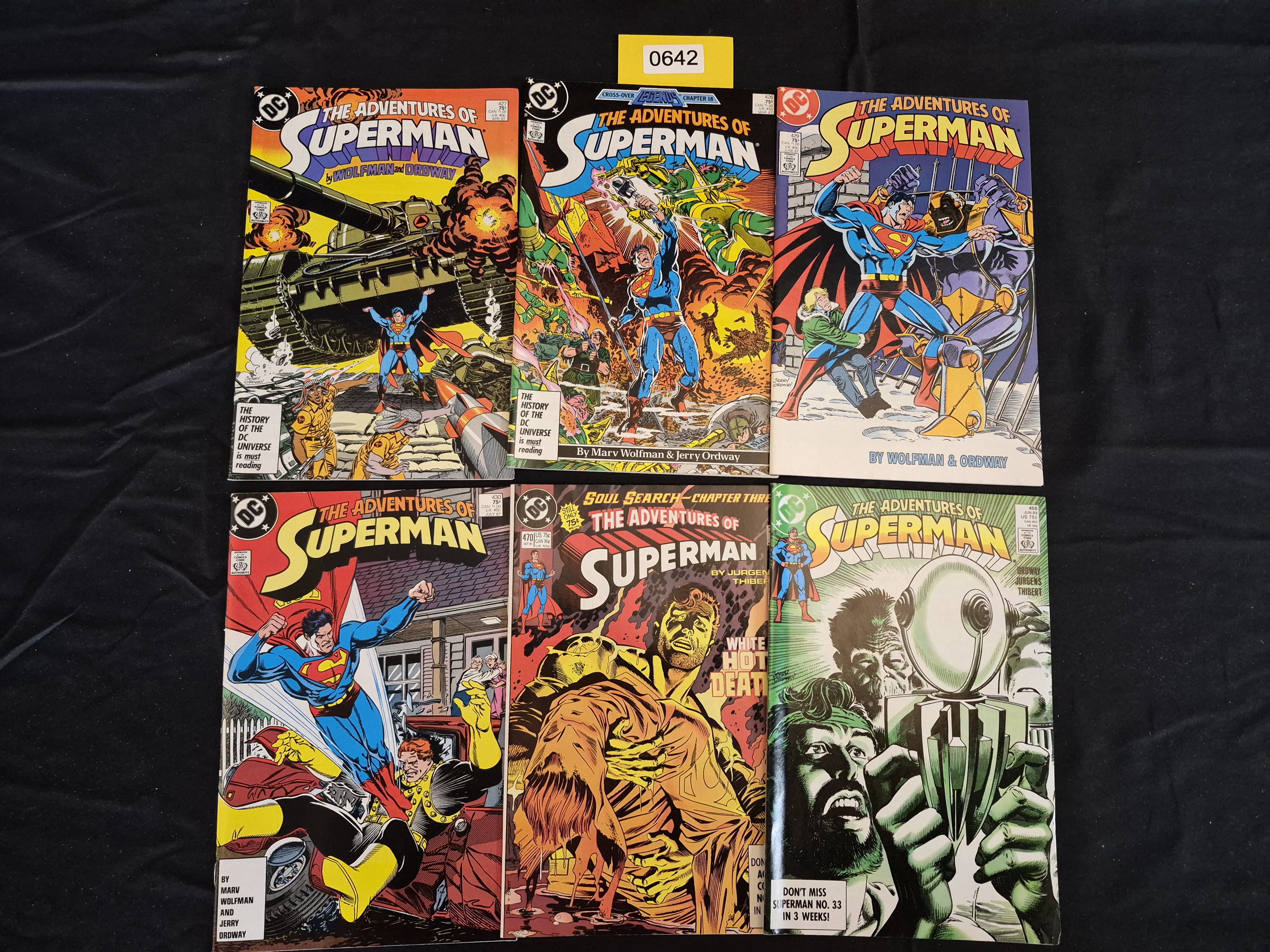 BID PER WHAT YOU SEE IN THE PHOTO, NOT THE AI GENERATED TITLES AND DESCRIPTIONS! A collection of six DC Comics periodicals from the series The Adventures of Superman, published during the Modern Age of Comics between 1987 and 1990. The lot includes the following specific issues: 427 (April 1987), 426 (March 1987, featuring the “Legends Chapter 18” crossover), 429 (June 1987), 430 (July 1987), 470 (September 1990, marked “Soul Search Chapter Three”), and 455 (June 1989). Each book is constructed of standard paper stock with saddle-stitched binding and features full-color illustrated covers depicting Superman in various action sequences. The comics are attributed to various creative teams including Marv Wolfman, Jerry Ordway, and Dan Jurgens.