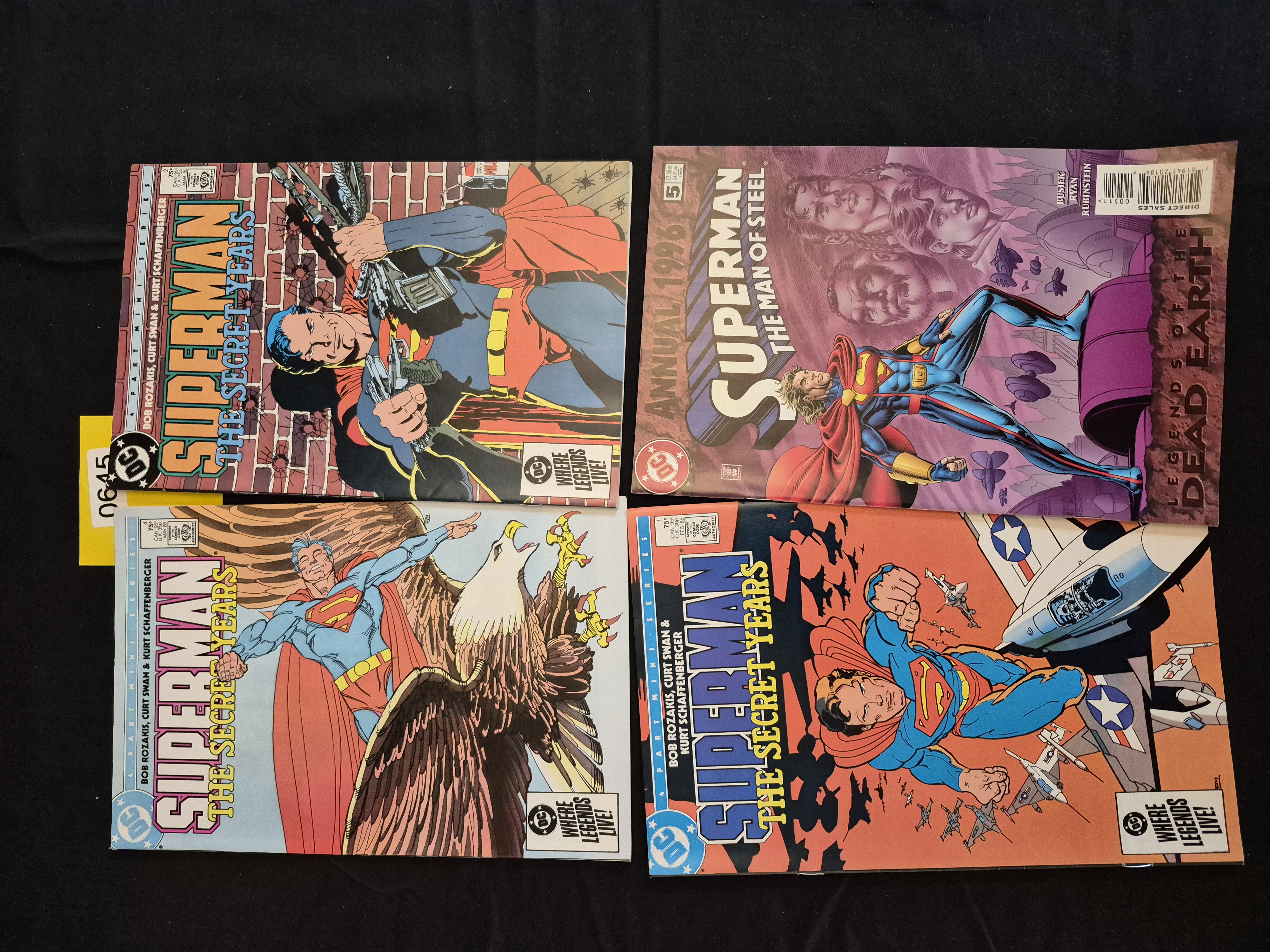 BID PER WHAT YOU SEE IN THE PHOTO, NOT THE AI GENERATED TITLES AND DESCRIPTIONS! A collection of four DC Comics publications from the Bronze and Modern comic book ages, primarily featuring the character Superman. The lot includes three issues from the 1985 four-part mini-series Superman: The Secret Years (Issues #1, #2, and #4). These issues feature covers widely attributed in market consensus to Frank Miller, with interior work by Bob Rozakis, Curt Swan, and Kurt Schaffenberger, and were originally priced at 75¢. The fourth item is Superman: The Man of Steel Annual 1996 #5, titled “Legends of the Dead Earth,” originally priced at $2.95 US. All items feature colorful cover art characteristic of their respective publication eras.