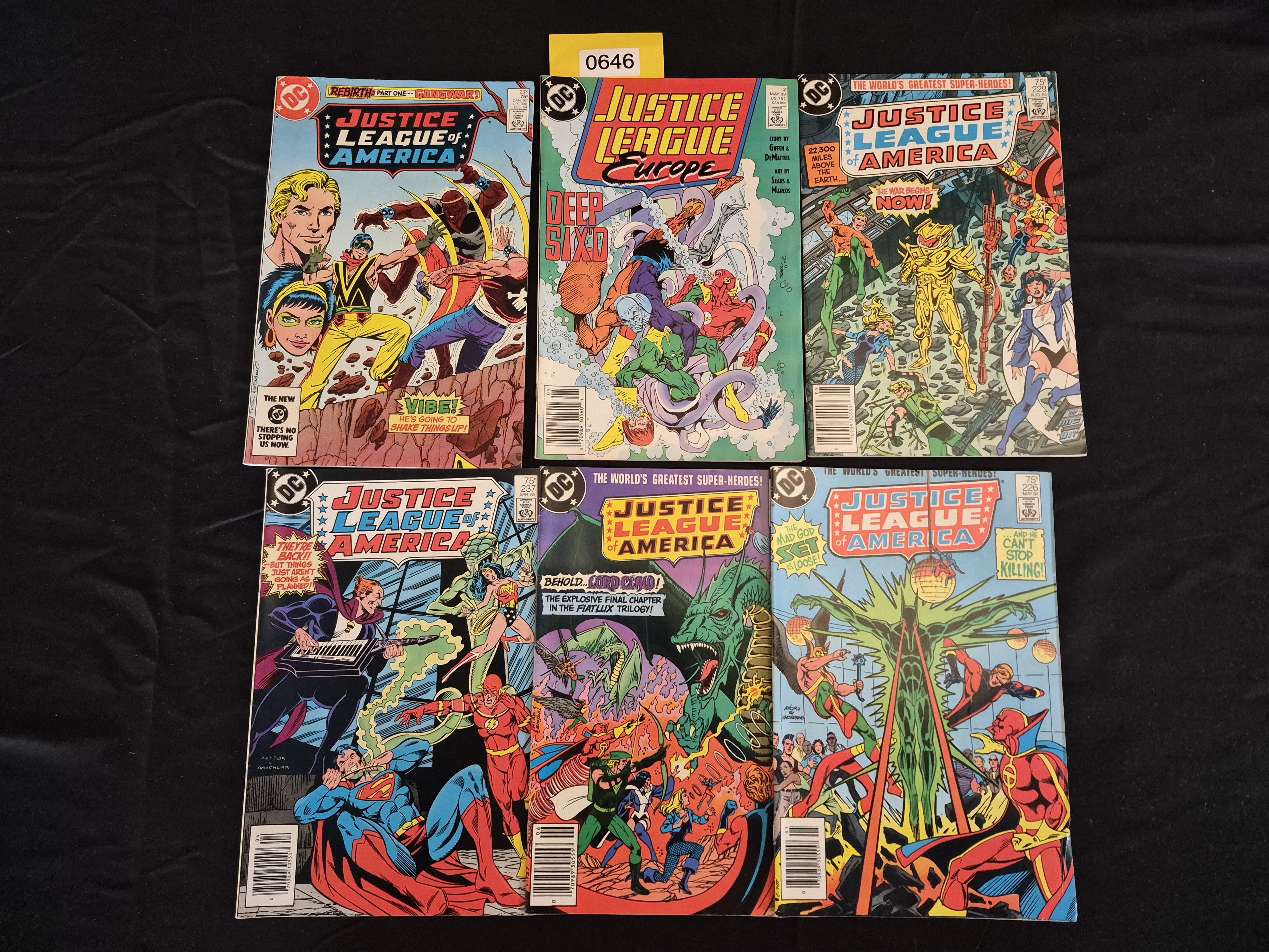 BID PER WHAT YOU SEE IN THE PHOTO, NOT THE AI GENERATED TITLES AND DESCRIPTIONS! A collection of six vintage DC Comics superhero periodicals, dating primarily from the mid-1980s (1984-1989). The collection includes five issues of Justice League of America and one issue of Justice League Europe. The issues present are Justice League of America #233 (Dec 1984, featuring “Rebirth Part One–Gangwar!”), #229 (Aug 1984), #237 (Apr 1985), #240 (Jul 1985), and #226 (May 1984), along with Justice League Europe #2 (May 1989). The comic books are saddle-stitched paper periodicals featuring full-color paper covers depicting various members of the Justice League, such as Superman, Wonder Woman, Aquaman, and The Flash. Cover prices range from US 75 cents to 95 cents.