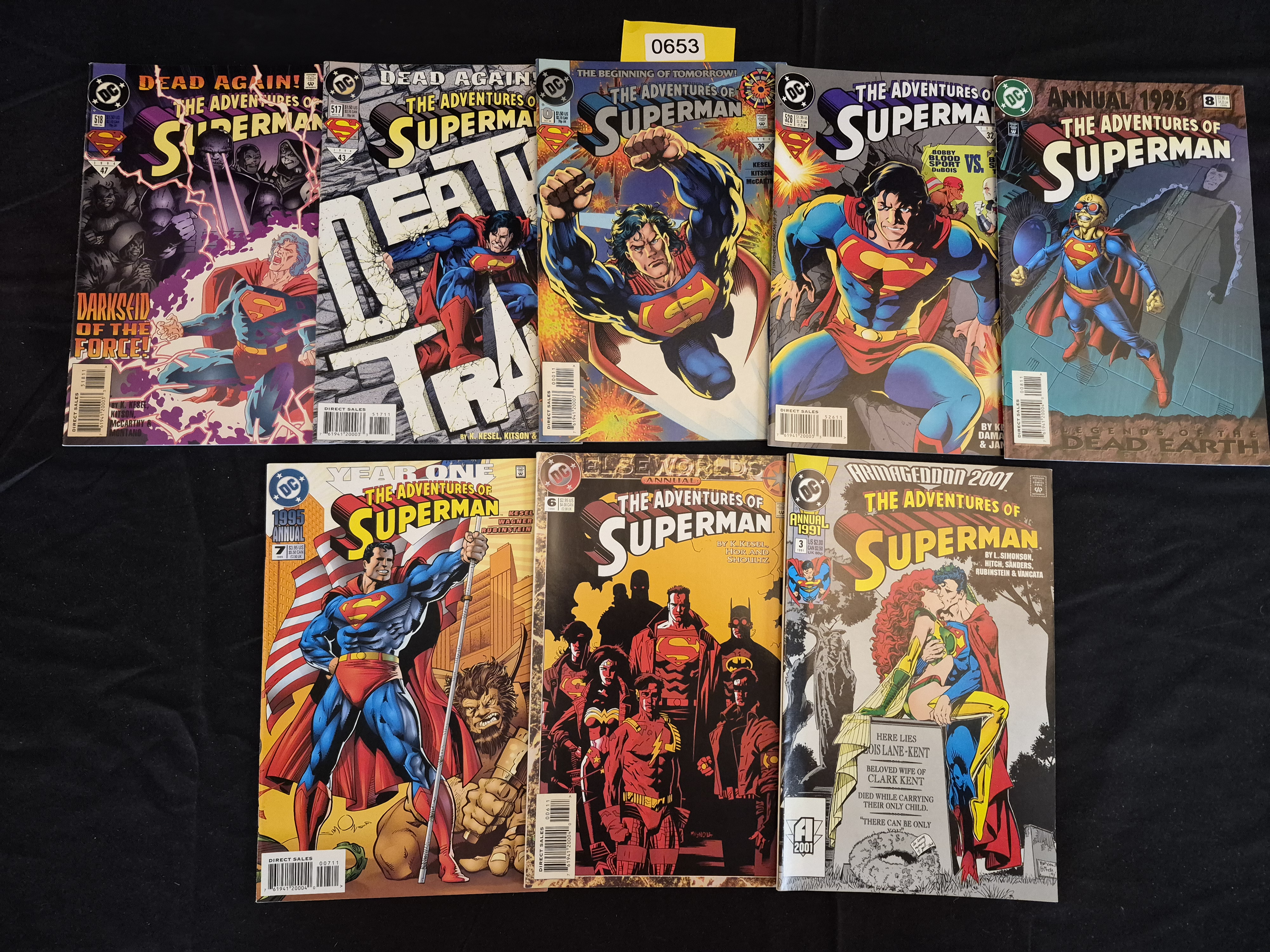 BID PER WHAT YOU SEE IN THE PHOTO, NOT THE AI GENERATED TITLES AND DESCRIPTIONS! A collection of nine Modern Age DC Comics periodicals from the series The Adventures of Superman. The lot consists of a mix of numbered issues and annual specials, predominantly dating from the early to mid-1990s. The comics feature full color covers and interior pages printed on paper, all displaying the DC Comics logo and “Direct Sales” barcodes. Specific issues identified include numbered issues such as #517 (“Death Train”), #518 (“Dead Again!”), and #526. The collection also features four Annuals: Annual 1991 (Issue 3, “Armageddon 2001”), Annual 1994 (Issue 6, “Elseworlds”), Annual 1995 (Issue 7, “Year One”), and Annual 1996 (Issue 8, “Legends of the Dead Earth”). These issues cover major storylines from the era, including the aftermath of the Death of Superman and various crossover events.