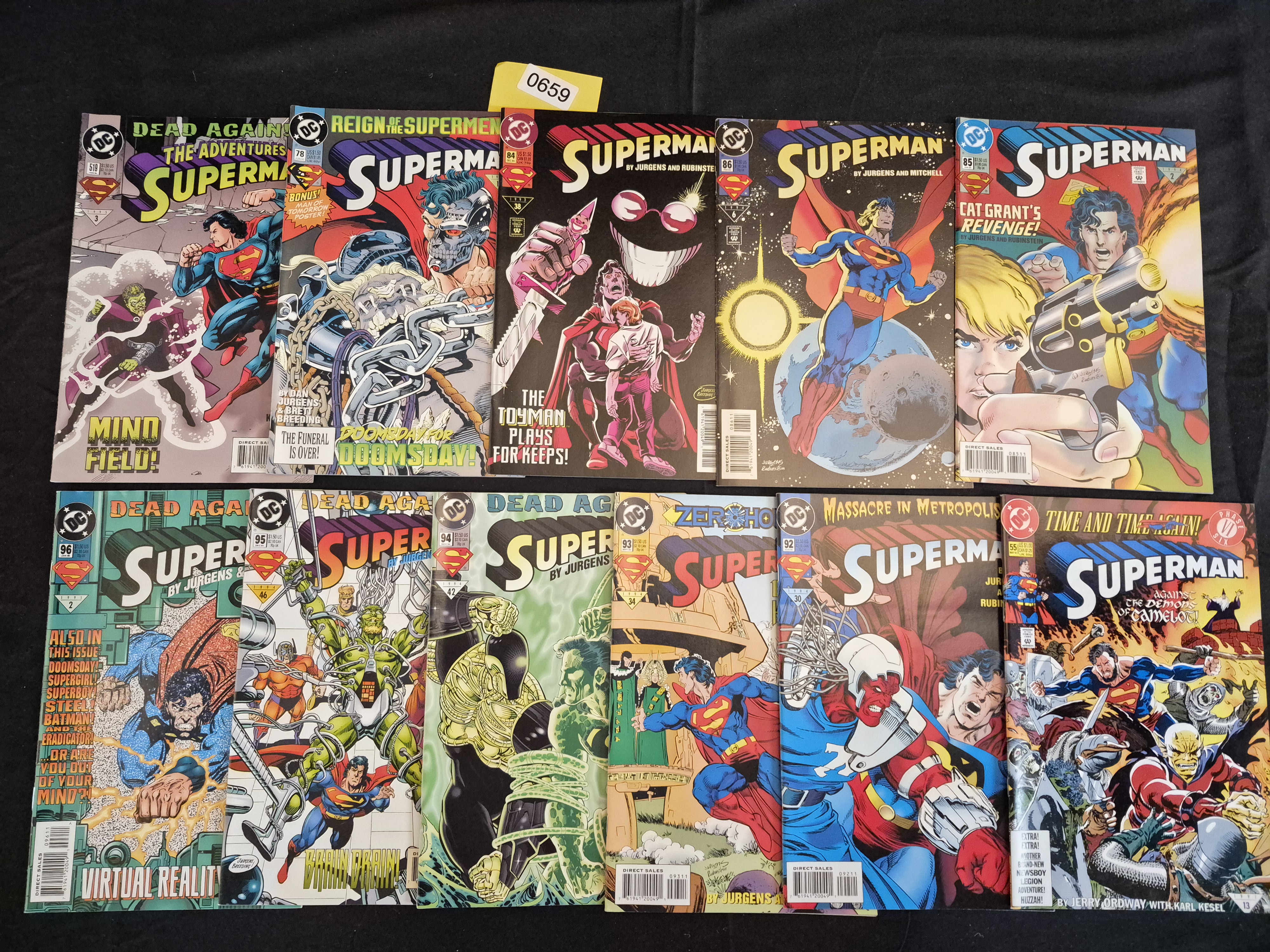 BID PER WHAT YOU SEE IN THE PHOTO, NOT THE AI GENERATED TITLES AND DESCRIPTIONS! A collection of twelve American comic books published by DC Comics during the Modern Age, circa 1993–1994. The lot focuses on the character Superman, featuring titles such as Superman and The Adventures of Superman. The issues visible include key storylines from the era, such as “Reign of the Supermen,” “Dead Again,” and a “Zero Hour” tie-in. Specific visible issue numbers range from The Adventures of Superman #519 to Superman #55. The publications feature glossy paper stock covers with vibrant color artwork characteristic of 1990s superhero comics.