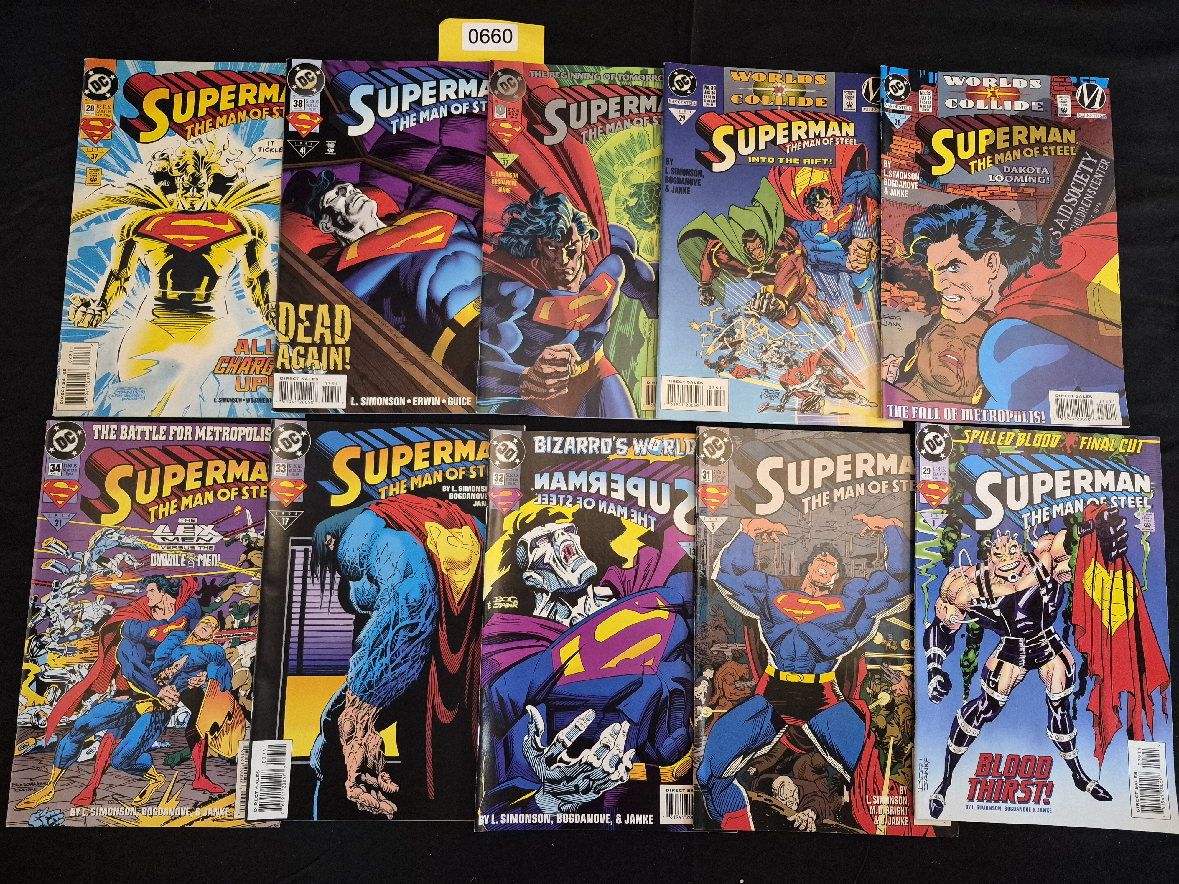 BID PER WHAT YOU SEE IN THE PHOTO, NOT THE AI GENERATED TITLES AND DESCRIPTIONS! A collection of 12 DC Comics comic books from the 1990s, all part of the Superman The Man of Steel series. The issues are dated primarily 1993 and 1994 and feature the contemporary art style of the era. The collection includes issues numbered #0, #28, #29, #30, #31, #32, #33, #34, #35, #36, #37, and #38. Notable storylines represented include Dead Again!, the Worlds Collide crossover, The Fall of Metropolis!, and Bizarro’s World. Each book is printed on paper with glossy cardstock covers and displays the DC Comics logo and the Comics Code Authority seal. Cover prices are marked as $1.50 US.