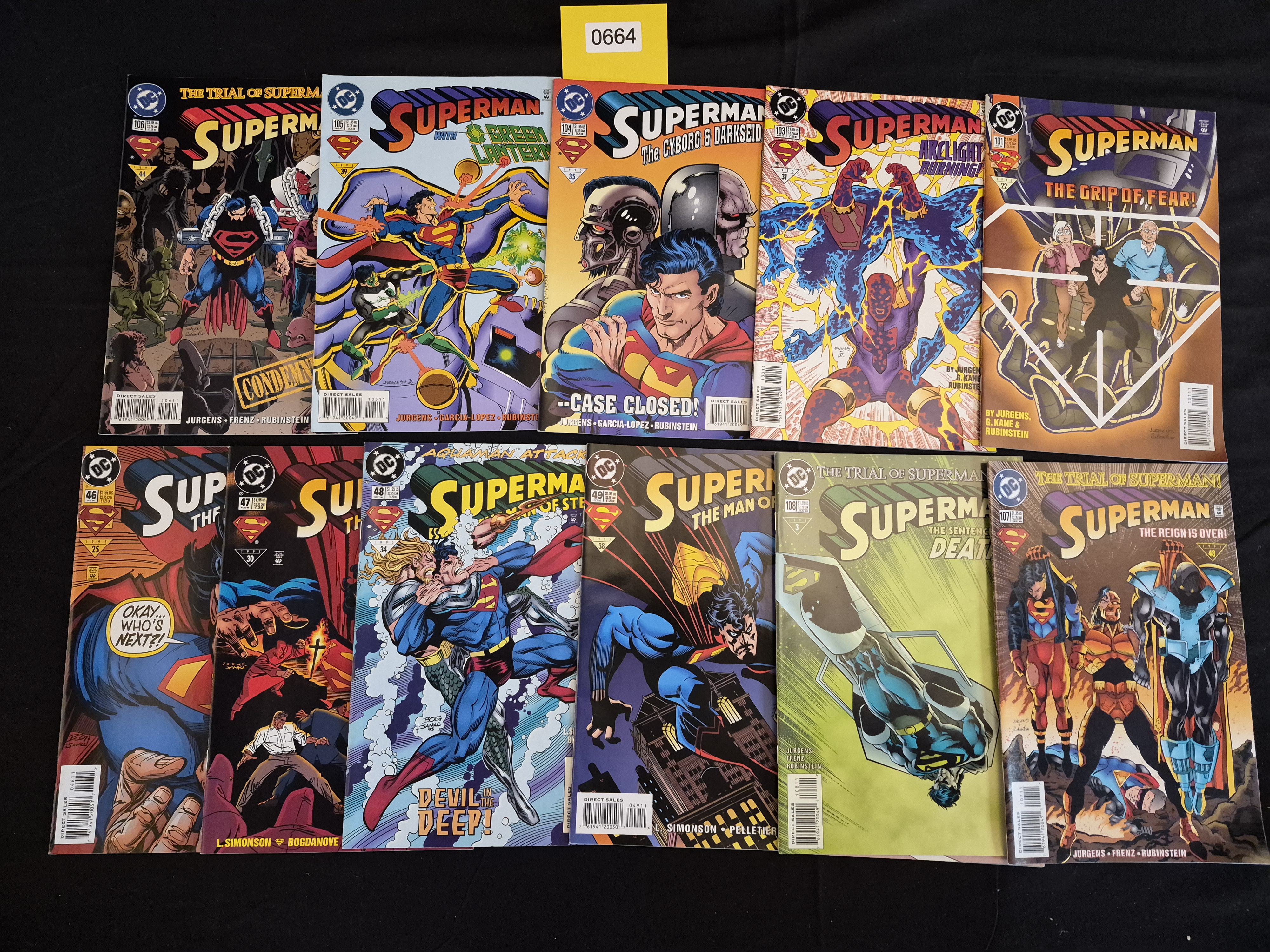 BID PER WHAT YOU SEE IN THE PHOTO, NOT THE AI GENERATED TITLES AND DESCRIPTIONS! A collection of 11 American standard-size comic books published by DC Comics during the Modern Age, primarily dated 1995. The lot focuses on the main *Superman* title (1987 series) and includes one issue of *Superman: The Man of Steel*. The collection features multiple parts of the major crossover storyline "The Trial of Superman!"