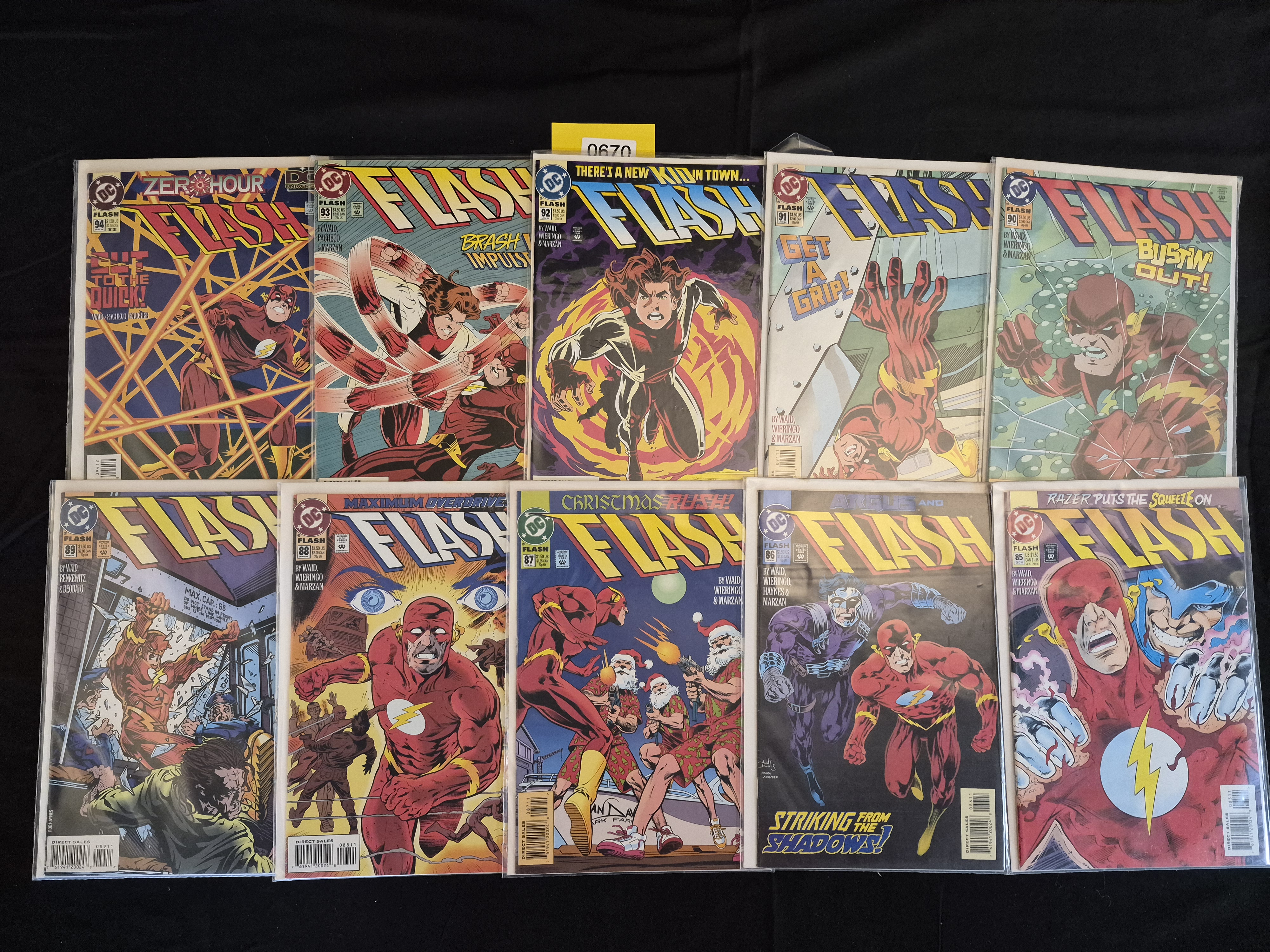BID PER WHAT YOU SEE IN THE PHOTO, NOT THE AI GENERATED TITLES AND DESCRIPTIONS! A collection of 10 individual comic books from the DC Comics series The Flash, featuring Wally West as the titular hero. This lot comprises a sequential run spanning issues #85 through #94, published during the 1990s. The comics are characterized by dynamic color cover art typical of the era. Key storylines and cover titles visible include the "Zero Hour" tie-in (#94), "Brash Impulse" (#93), "New Kid in Town" (#92), "Maximum Overdrive" (#88), and the seasonal "Christmas Flash!" (#87). The cover price is uniformly listed as $1.50 US and $2.00 CAN. All issues are enclosed within clear protective sleeves.