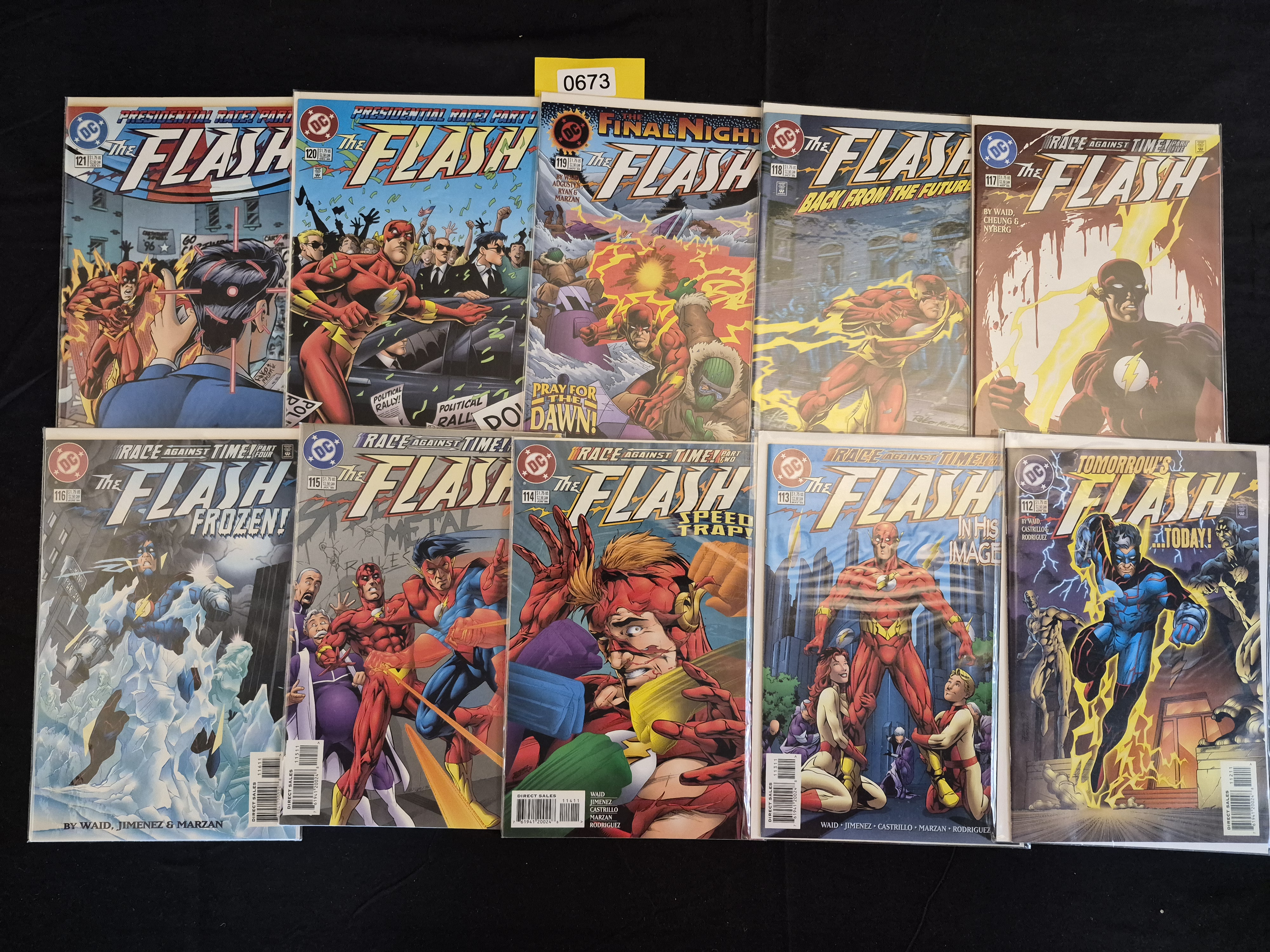 BID PER WHAT YOU SEE IN THE PHOTO, NOT THE AI GENERATED TITLES AND DESCRIPTIONS! A collection of ten sequential issues of the DC Comics title The Flash, Volume 2, dating from the Modern Age period of 1995 to 1996. The run includes issues #112 (September 1995) through #121 (June 1996). Key creators featured include writer Mark Waid and artists such as Carlos Pacheco, Jiminez, and Marzan. The collection covers major story arcs prominently advertised on the covers, including “Race Against Time!” and the “Presidential Race!”. The comics are standard paper format, full color, and originally priced at $1.75 USD. The issues are individually housed in protective plastic sleeves.