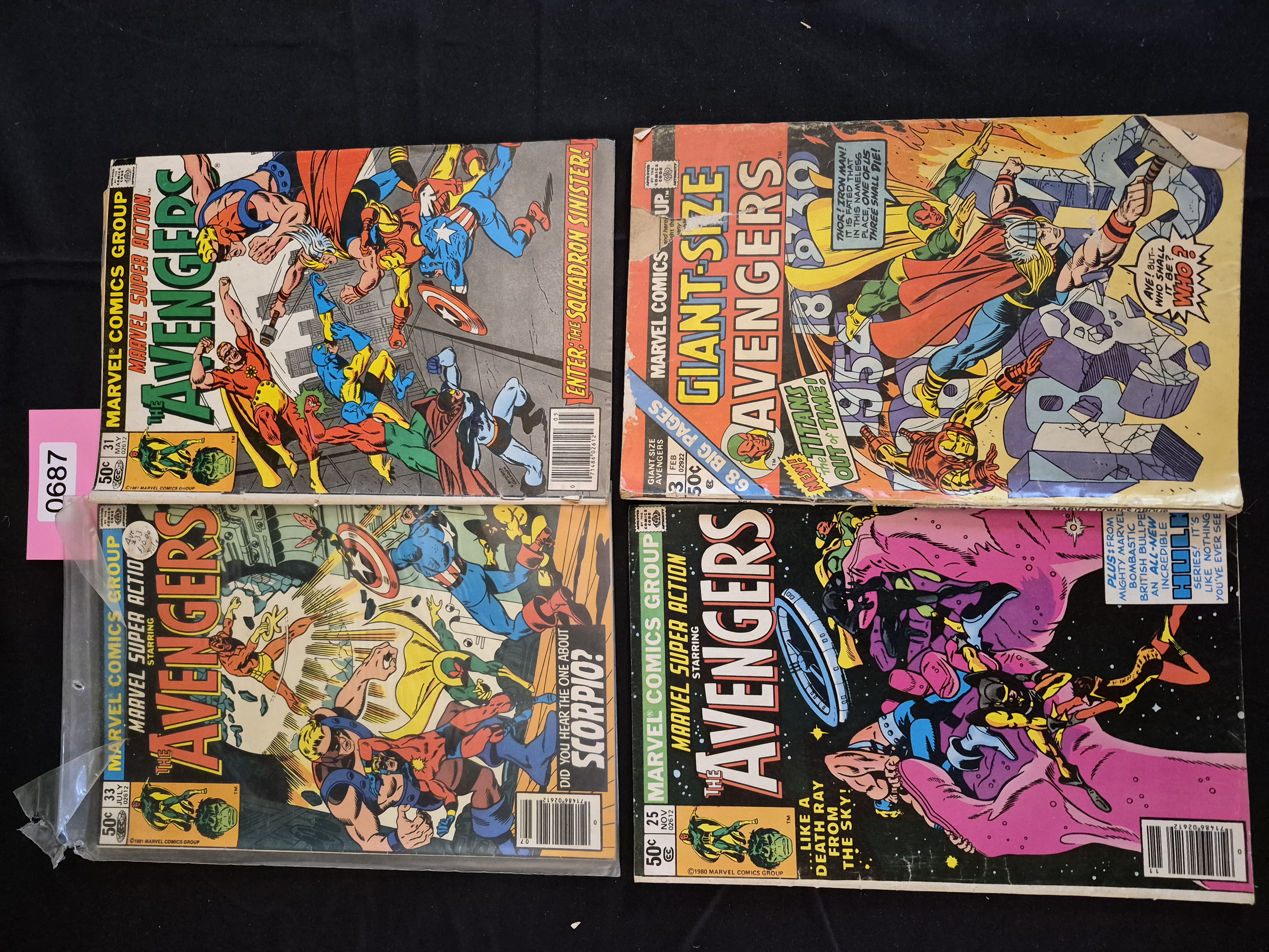 BID PER WHAT YOU SEE IN THE PHOTO, NOT THE AI GENERATED TITLES AND DESCRIPTIONS! A collection of four vintage paperback comic books published by Marvel Comics Group, primarily featuring the title The Avengers. The lot includes three standard-size issues and one oversized Giant-Size issue. All comics are priced at 50 cents and display the Comics Code Authority seal. The issues included are: Marvel Super Action featuring The Avengers #33 (July 1981); Marvel Super Action featuring The Avengers #31 (May 1981), captioned “Enter the Squadron Sinister!”; Marvel Super Action featuring The Avengers #25 (November 1980), captioned “The Titans Out of Time!”; and Giant-Size Avengers #3 (February), noted as having “68 Big Pages.” The three 1980s issues feature modern barcodes on the cover.
