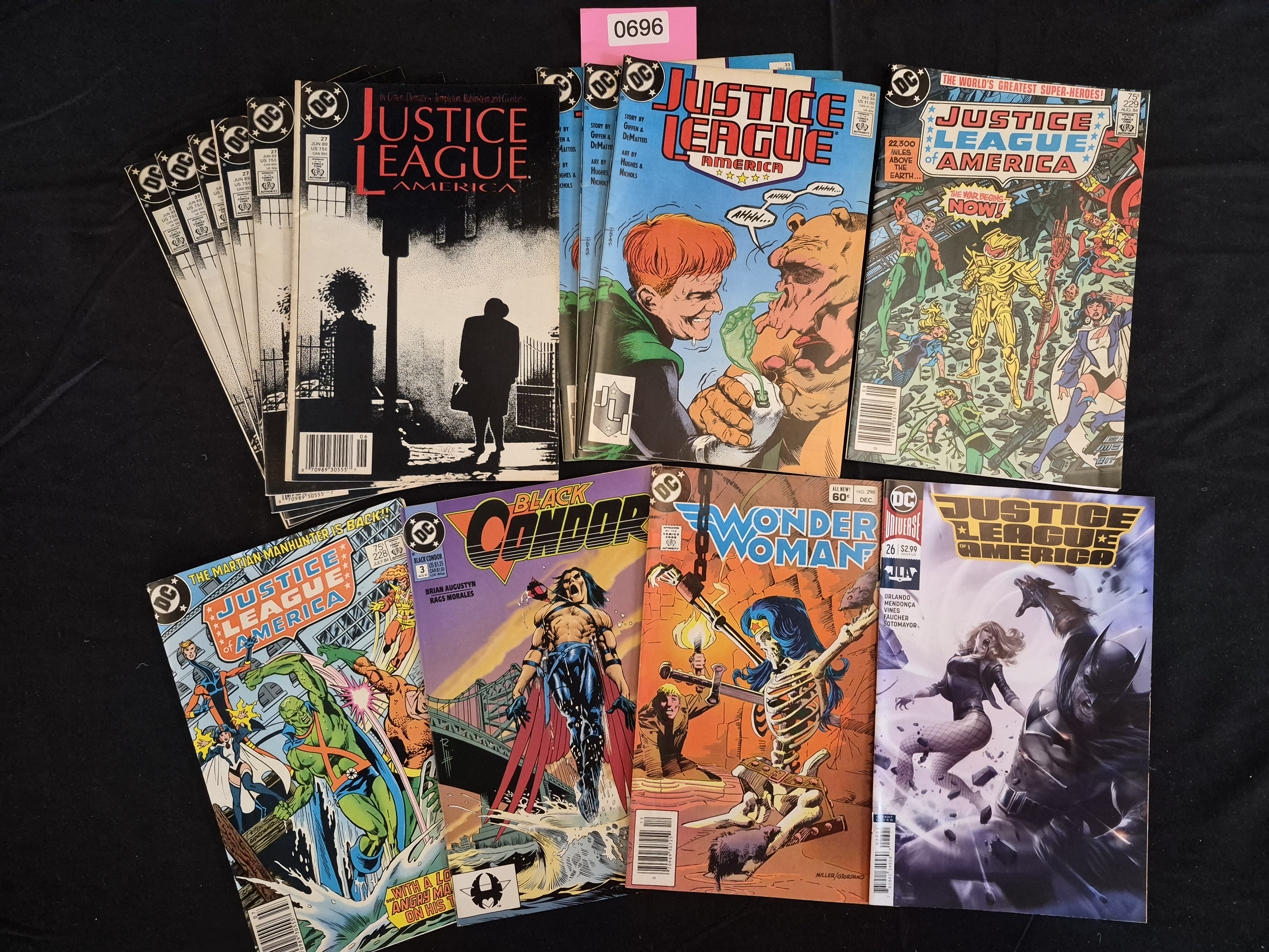 BID PER WHAT YOU SEE IN THE PHOTO, NOT THE AI GENERATED TITLES AND DESCRIPTIONS! A collection of 16 individual DC Comics periodicals dating primarily from the mid-1980s through the 1990s, spanning the late Bronze Age into the early Modern Age of comics. The lot is heavily focused on the Justice League franchise, containing 14 issues of Justice League America or Justice League of America. Specific visible issues include multiple copies of Justice League America #27 (June ’89) and #33 (Dec ’89), alongside single issues of Justice League of America #229 (Aug ’84), #228 (July ’84), and a modern Justice League of America issue #26 ($2.99 cover price). The collection also includes single issues of Black Condor #3 (Aug ’93) and Wonder Woman #298 (Dec). The comics are bound in traditional paper wraps and feature color and black-and-white cover art. Older issues prominently display the Comics Code Authority seal. An adhesive sticker labeled 0696 is affixed to the upper right quadrant of the lot.
