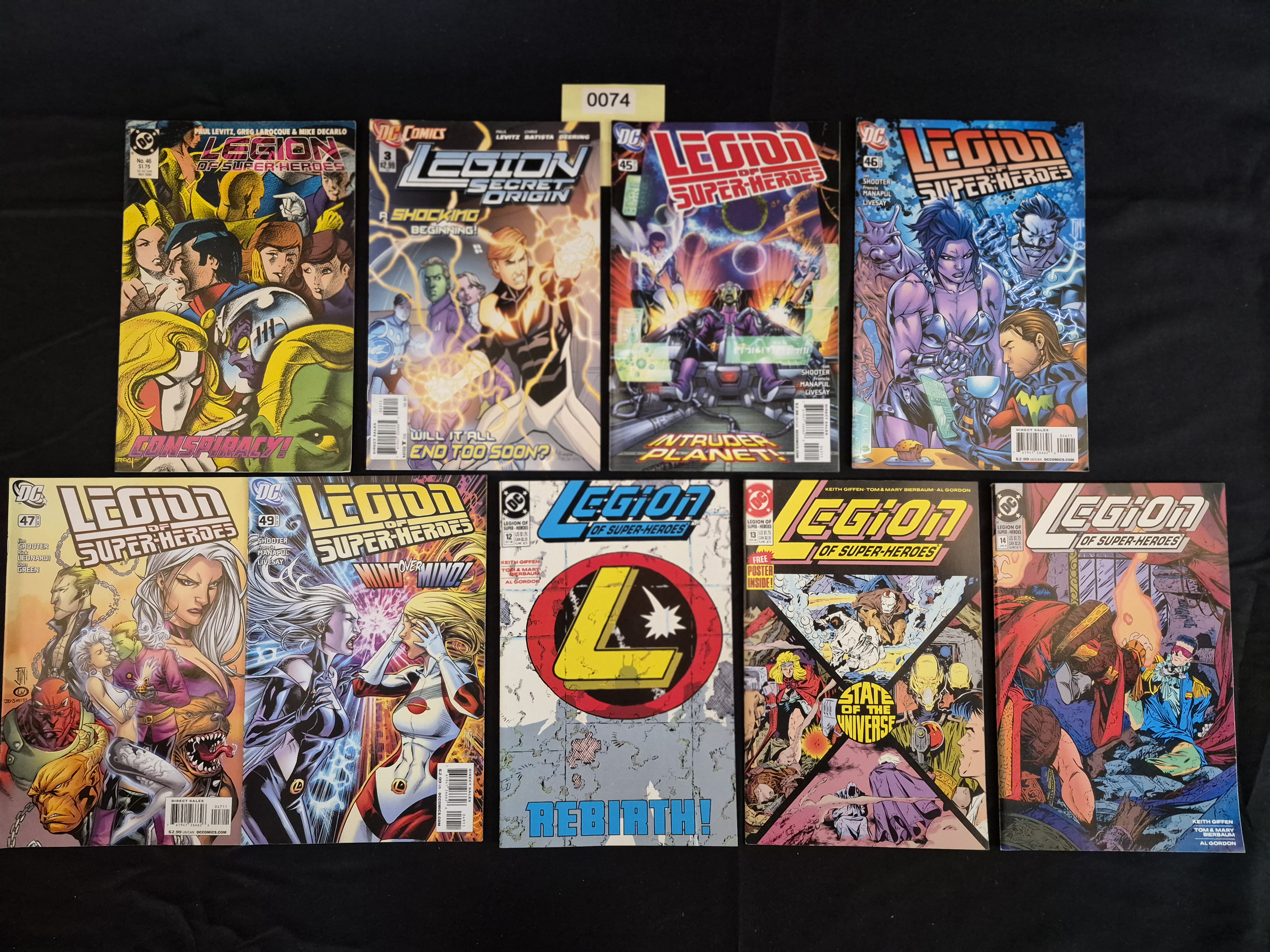 BID PER WHAT YOU SEE IN THE PHOTO, NOT THE AI GENERATED TITLES AND DESCRIPTIONS! This collection consists of ten individual comic books published by DC Comics, focusing on the long-running science fiction superhero franchise, the Legion of Super-Heroes. The lot includes issues from various runs, spanning different publication periods, as evidenced by the varied cover prices ranging from $1.75 to $2.99. Specific titles present include multiple issues of Legion of Super-Heroes (including issues numbered 46, 45, 47, 49, 12, 13, and 14), one issue titled Legion of Super-Heroes: Rebirth!, and one issue of the limited series Legion Secret Origin (#3). The books feature work by notable creators associated with the franchise, including Jim Shooter, Francis Manapul, Keith Giffen, and Paul Levitz. The comics are printed on paper stock with colorful, dynamic cover art typical of modern superhero publications. A small yellow inventory note bearing the number 0074 is affixed above the top row.