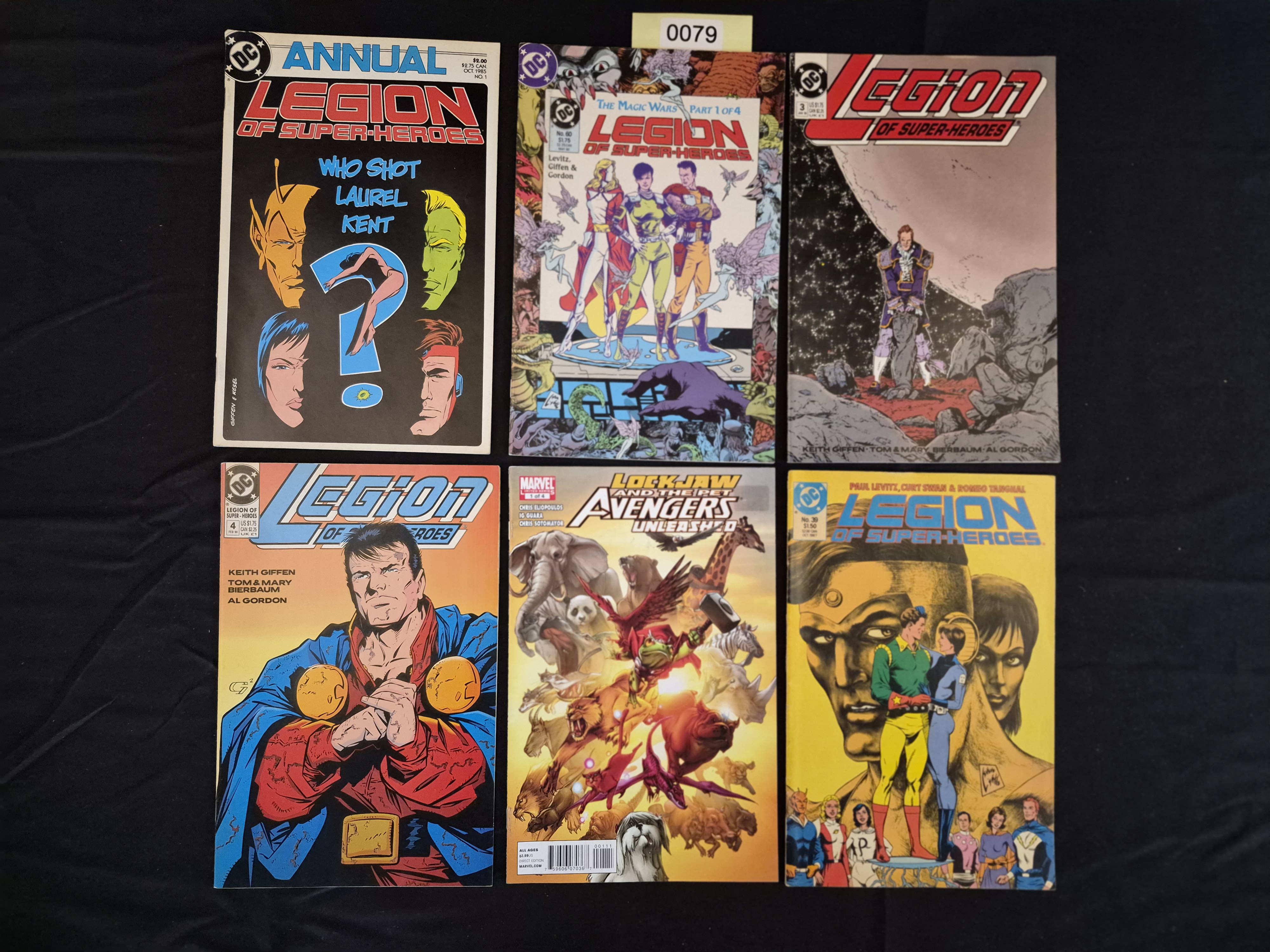 BID PER WHAT YOU SEE IN THE PHOTO, NOT THE AI GENERATED TITLES AND DESCRIPTIONS! The collection consists of 6 individual American comic books constructed of staple-bound paper and cardstock covers, featuring full-color illustrations typical of the superhero genre. The lot is predominantly focused on the DC Comics title *Legion of Super-Heroes* from the Modern Age, dating primarily from the mid-1980s to 1990s, often associated with the ‘Five Years Later’ era (Volume 4). The DC issues include *Legion of Super-Heroes* Annual No. 1 (Oct 1985, priced $2.00), *Legion of Super-Heroes* No. 60 (The Magic Wars Part 1 of 4, priced $1.75), *Legion of Super-Heroes* No. 3 (priced $1.75), *Legion of Super-Heroes* No. 4 (Feb 1990, priced $1.75), and *Legion of Super-Heroes* No. 39 (Dec 1987, priced $1.50). The collection also includes one Marvel Comics title, *Lockjaw and the Pet Avengers Unleashed* No. 1 of 4 (priced $2.99 US). A white inventory slip marked “0079” is affixed to the top edge of the middle comic in the top row.