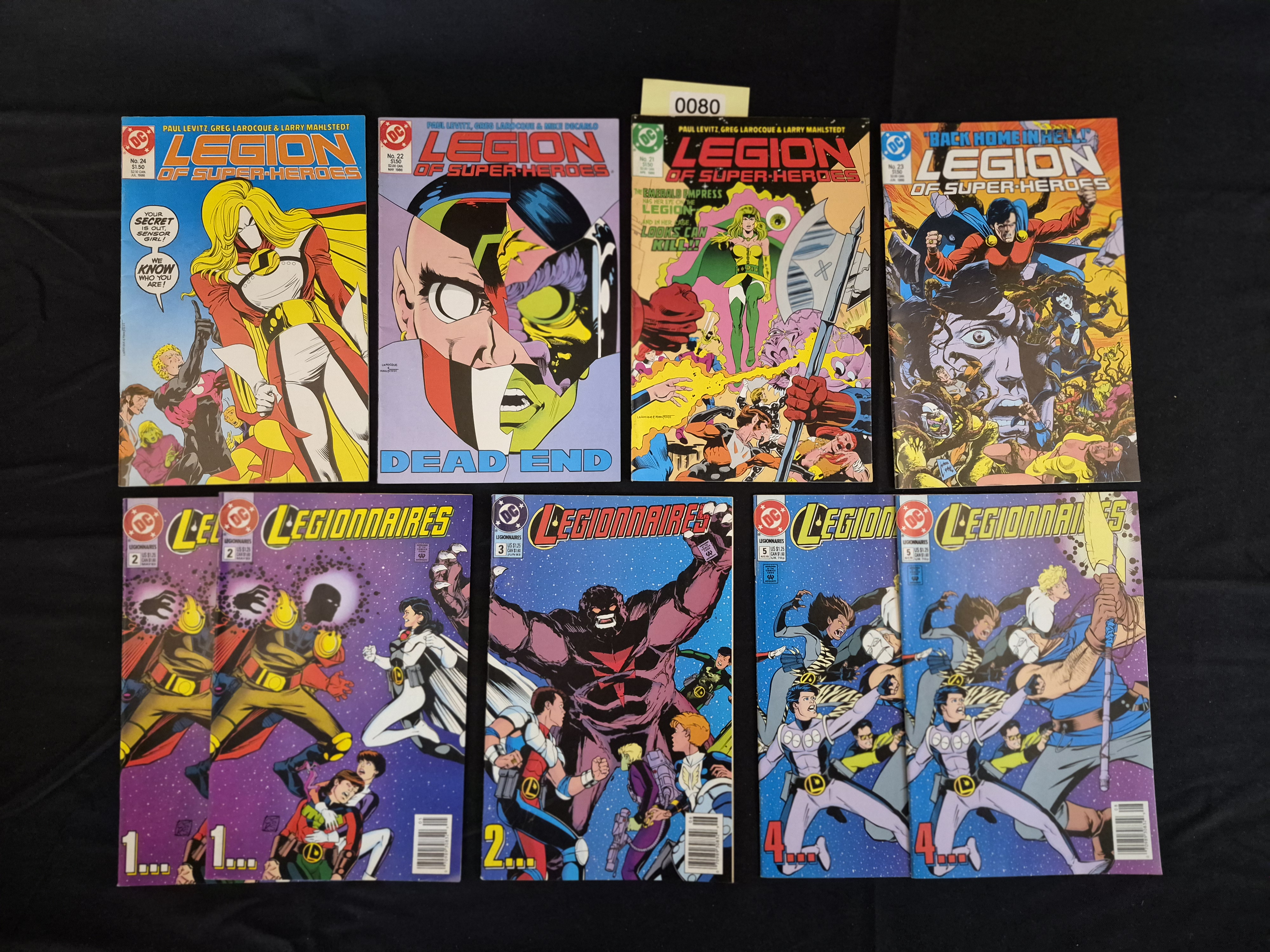 BID PER WHAT YOU SEE IN THE PHOTO, NOT THE AI GENERATED TITLES AND DESCRIPTIONS! A collection of twelve DC Comics issues featuring the Legion of Super-Heroes franchise, published between the late 1980s and early 1990s. The items are standard full-color comic books printed on paper. The lot is comprised of two distinct series. The first series, *Legion of Super-Heroes* (4th Series, 1988), includes four issues: Nos. 21, 22, 23, and 24. Issue No. 21 bears a small yellow inventory sticker marked “0080” affixed to the upper cover. The second series, *Legionnaires* (1993), includes eight issues, consisting of Nos. 1 (two copies), 2, 3, 4 (two copies), and 5 (two copies).