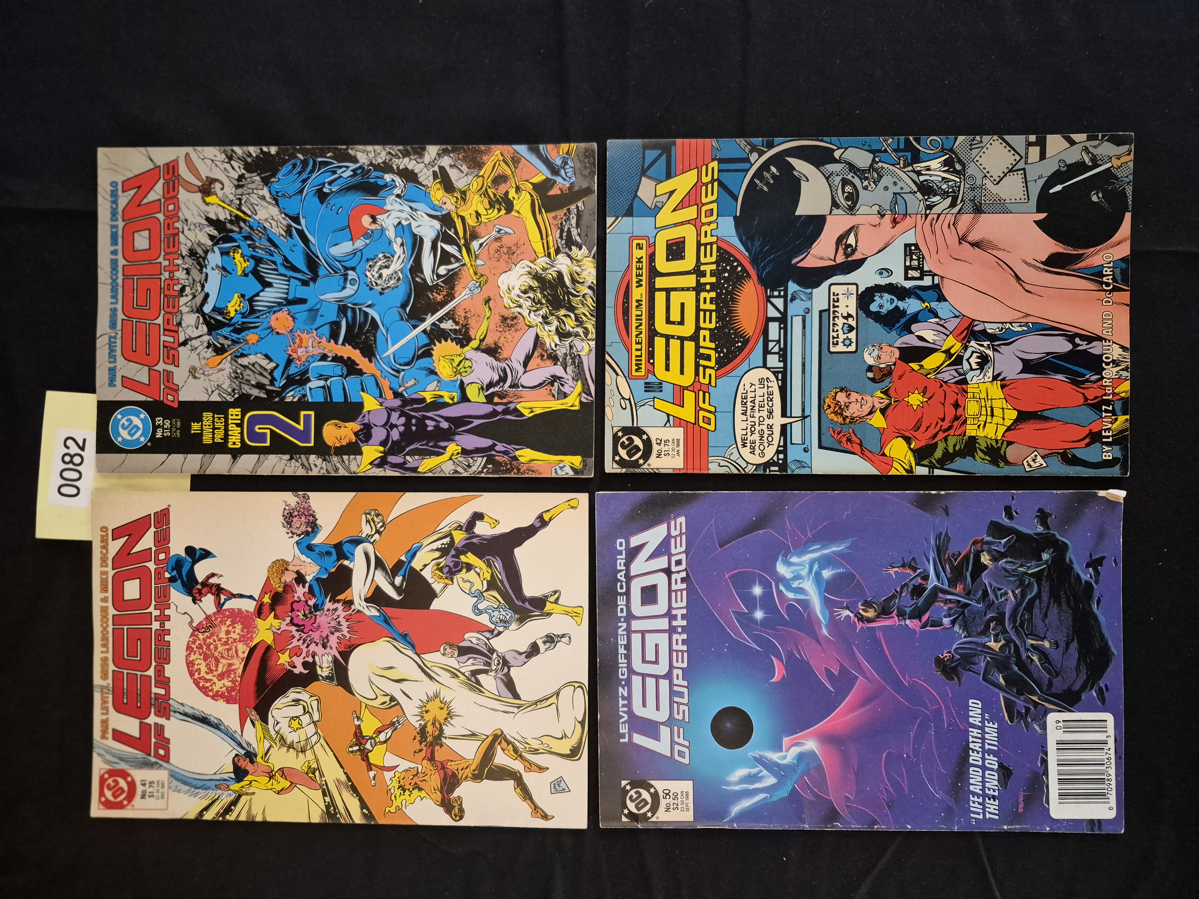 BID PER WHAT YOU SEE IN THE PHOTO, NOT THE AI GENERATED TITLES AND DESCRIPTIONS! A collection of four late Copper Age American comic books published by DC Comics, all issues from the Legion of Super-Heroes series (3rd Series, 1984-1989). The issues included are No. 33 (April 1987, “The Universo Project Chapter 2”), No. 41 (December 1987), No. 42 (January 1988, “Millennium Week 2”), and No. 50 (September 1988, “Life and Death and the End of Time”). Key creative credits include Paul Levitz, Greg LaRocque, Keith Giffen, and Mike DeCarlo. The items are constructed of color-printed paper with stapled bindings.