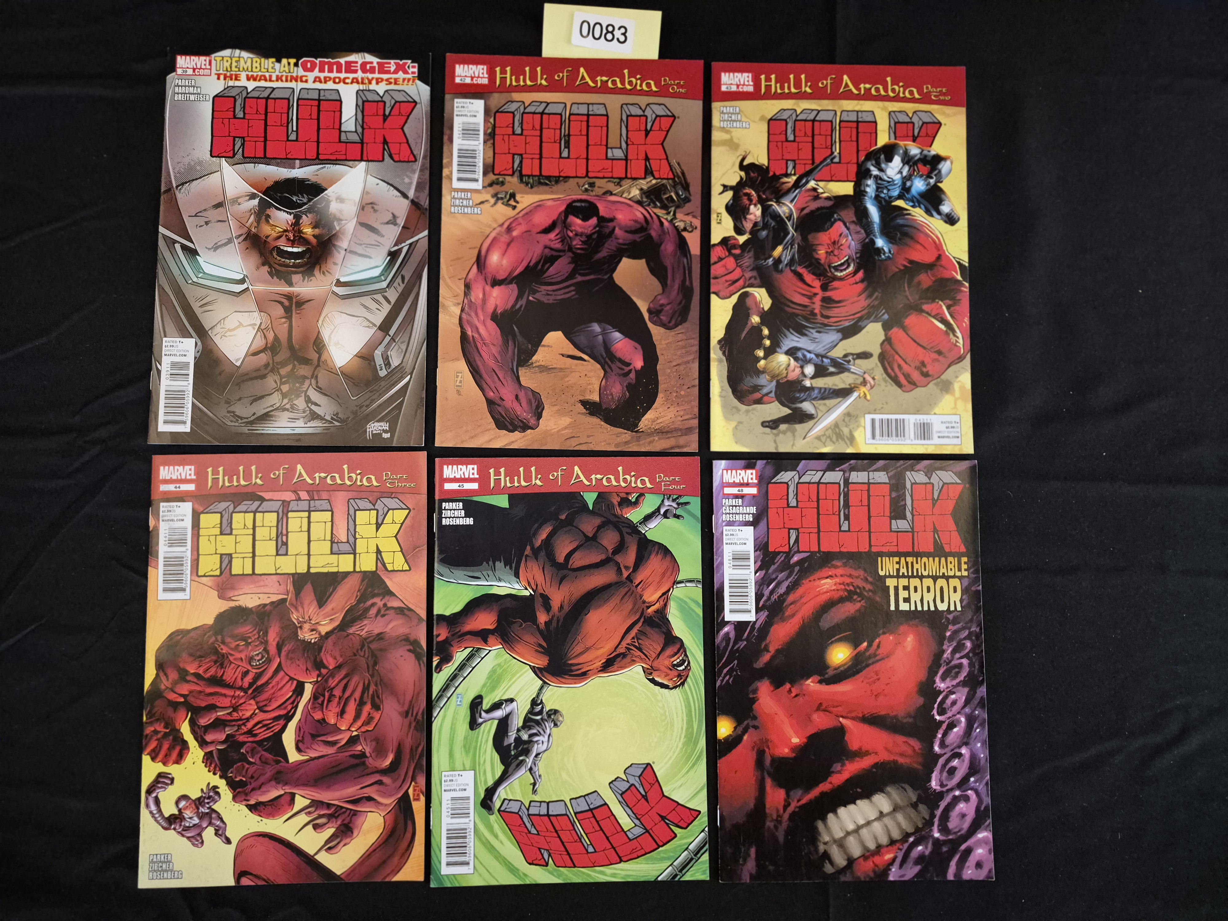 BID PER WHAT YOU SEE IN THE PHOTO, NOT THE AI GENERATED TITLES AND DESCRIPTIONS! A collection of six modern Marvel Comics issues from the Hulk series (Volume 2, 2008-2012), prominently featuring the character Red Hulk (General Thunderbolt Ross). The lot includes six standard-sized, staple-bound comic books with gloss paper covers. Specific issues included are: Issue #39 (“The Walking Apocalypse”), the complete four-part story arc “Hulk of Arabia” (Issues #42, #43, #44, and #45), and Issue #48 (“Unfathomable Terror”). All visible copies are designated as Direct Editions, indicated by the visible barcode structure, and feature a cover price of $2.99 US. The comics are characterized by full-color artwork and modern printing techniques.