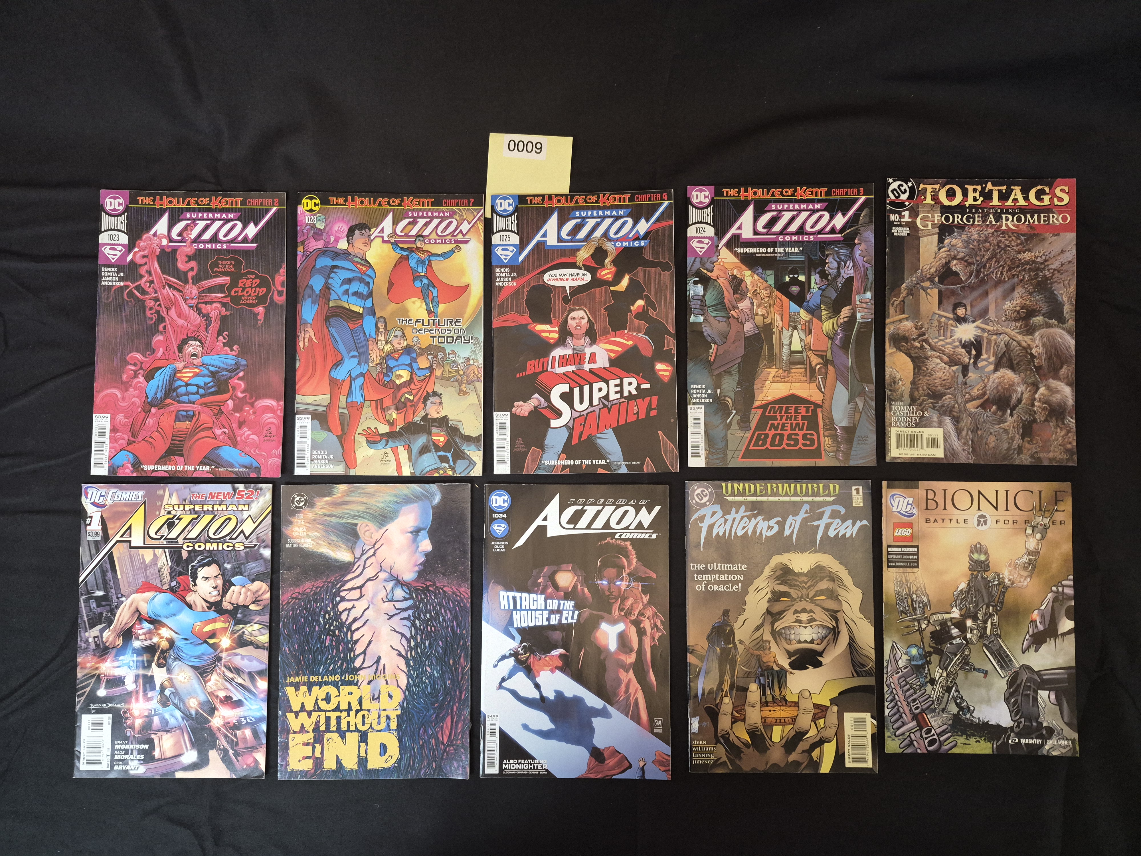 BID PER WHAT YOU SEE IN THE PHOTO, NOT THE AI GENERATED TITLES AND DESCRIPTIONS! A collection of ten modern American comic books, predominantly published by DC Comics and its Vertigo imprint, printed on glossy paper. The lot includes six issues of Action Comics, spanning various publishing eras, including The New 52 #1 and recent DC Universe issues (#1023, 1024, 1025, 1028, 1034), many of which feature the “House of Kent” storyline. The remaining four titles include Toetags #1 (featuring George A. Romero), World Without End (Book 3 of 6), Underworld Unleashed: Patterns of Fear, and the licensed title Bionicle: Battle for Power #14 (DC/LEGO). All items feature visible issue numbers, bar codes, and original retail prices ranging from $2.95 to $4.99 USD. A yellow inventory sticker bearing the number “0009” is present above the top row.