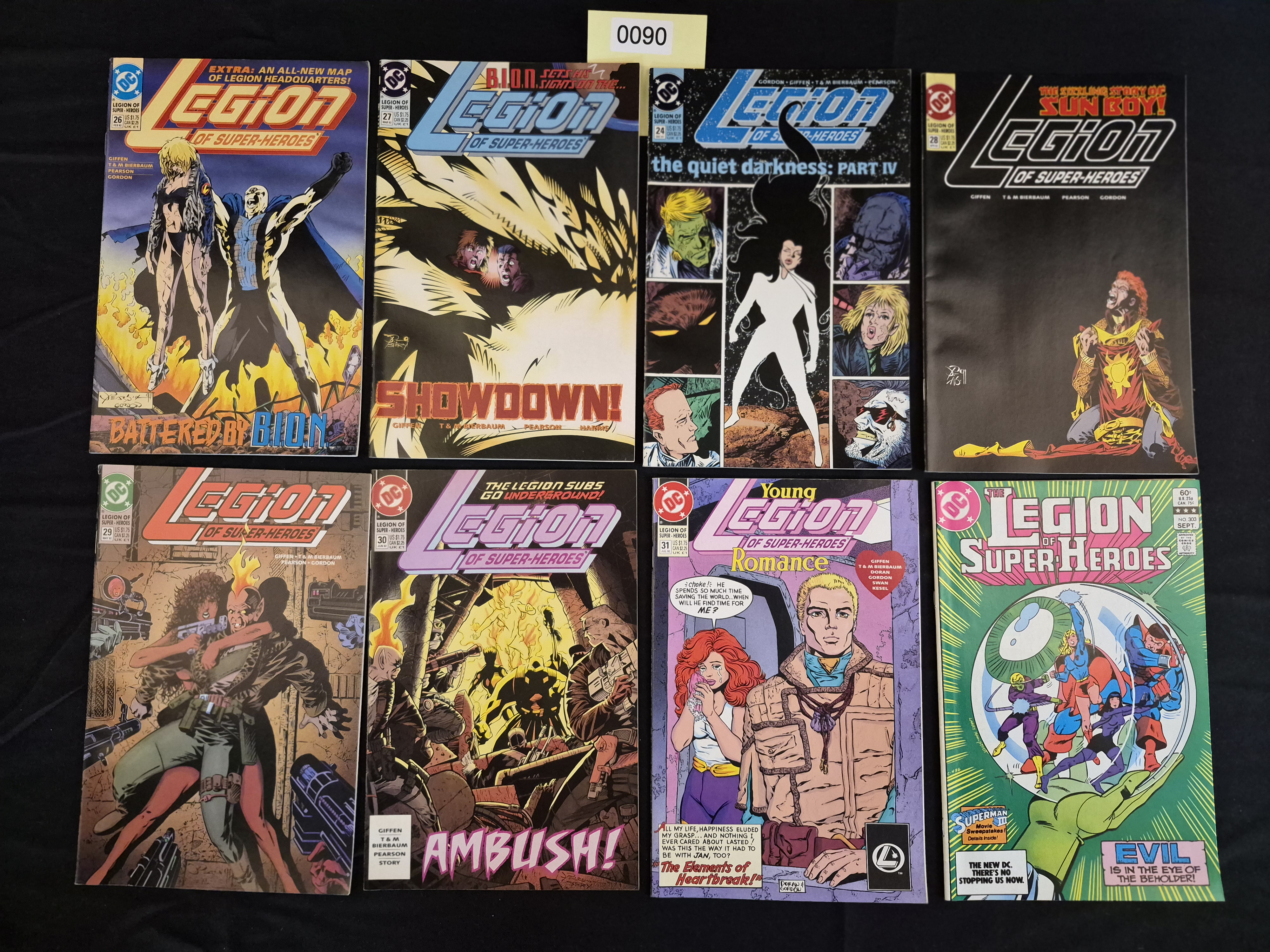 BID PER WHAT YOU SEE IN THE PHOTO, NOT THE AI GENERATED TITLES AND DESCRIPTIONS! A collection of eight American comic books published by DC Comics, primarily drawn from the Legion of Super-Heroes series. The majority of the lot consists of issues from the fourth volume (1989-1993 run), reflecting the Copper to Modern Age period. The specific issues visible include #24, #26, #27, #28, #29, #30, and #31 (featuring the “Young Legion Romance” variant cover). Also included is one earlier issue, #303 (September, featuring a 60¢ cover price). Key storylines and titles visible on the covers include “Battered by BION!,” “Showdown!,” “Ambush!,” and “the quiet darkness: PART IV.” The comics are constructed of typical glossy paper and feature full-color covers.