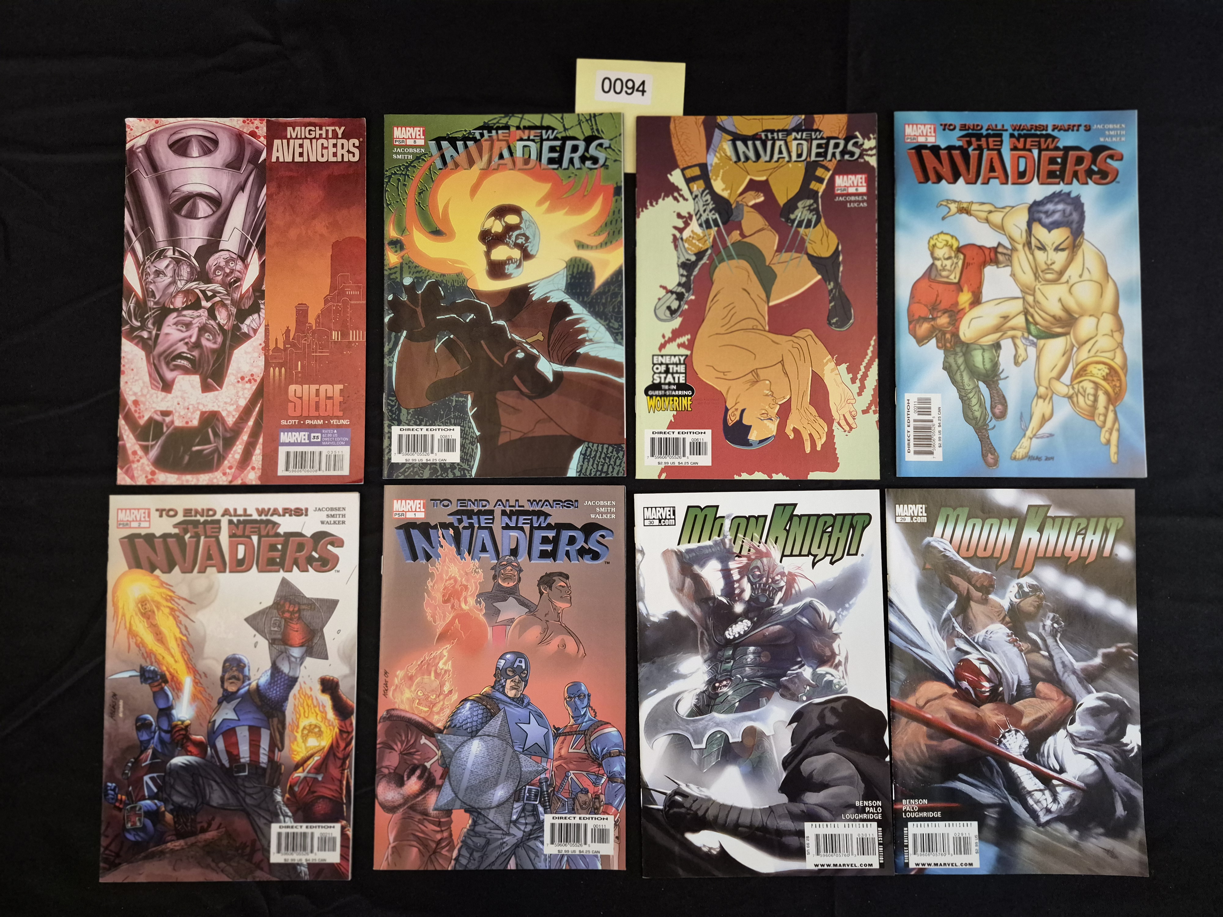BID PER WHAT YOU SEE IN THE PHOTO, NOT THE AI GENERATED TITLES AND DESCRIPTIONS! A collection of eight modern comic books published by Marvel Comics, primarily dating from the mid-2000s era, centered around the series The New Invaders (2004). The lot includes three distinct titles. The majority are issues of The New Invaders, featuring characters such as Captain America, Namor, Ghost Rider, and a Wolverine tie-in. Specific issues visible include one issue of Mighty Avengers (Volume 1, Siege tie-in), five issues of The New Invaders (issues 1, 2, 3, 6, and 8), and two issues of Moon Knight (issues 29 and 30). All items are standard paper-based comic books with glossy, full-color covers. Visible markings include the Marvel logo, issue numbers, barcodes, and a consistent pricing of $2.99 US, marked as “Direct Edition” copies.