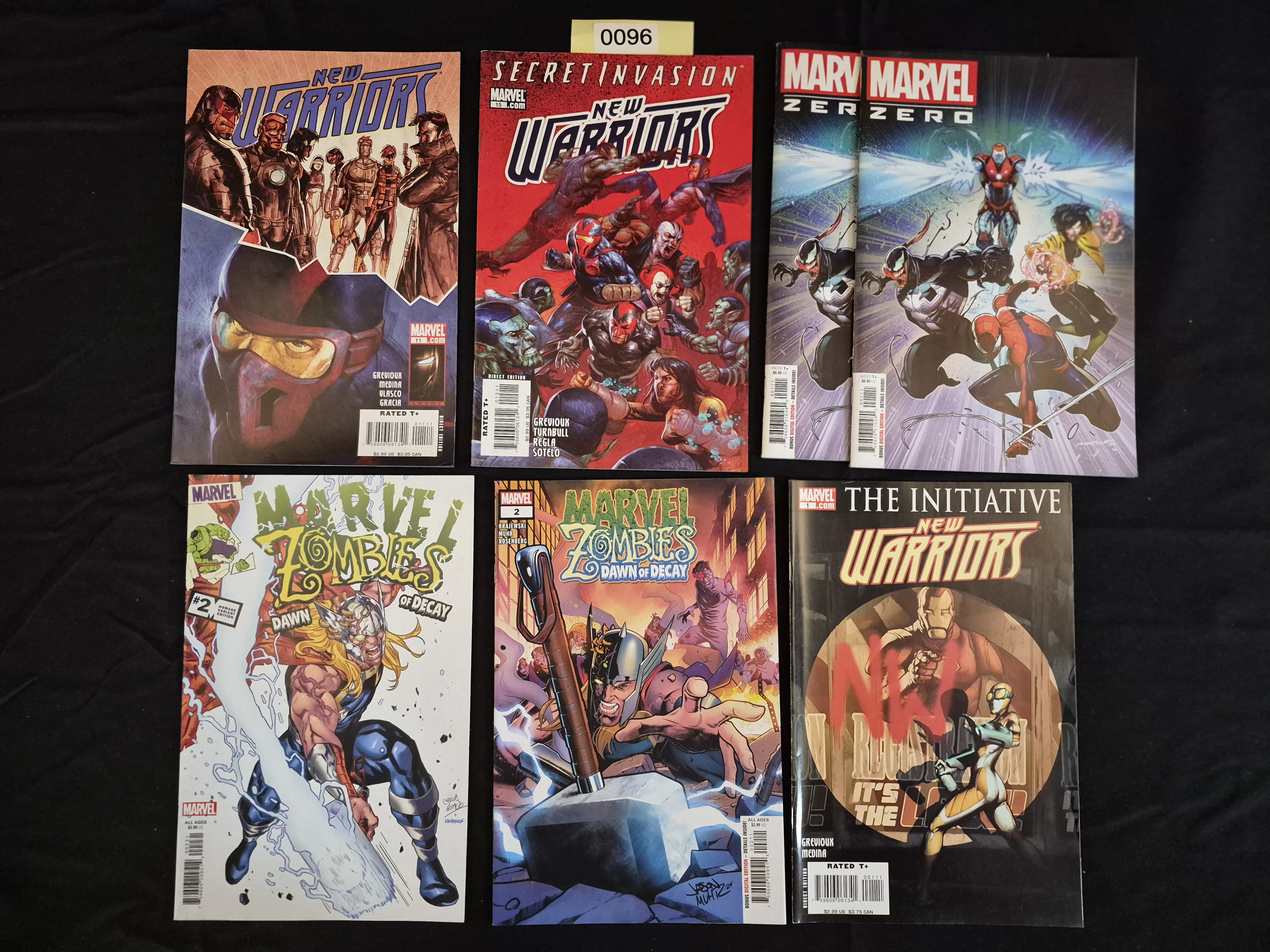BID PER WHAT YOU SEE IN THE PHOTO, NOT THE AI GENERATED TITLES AND DESCRIPTIONS! A collection of seven modern comic books published by Marvel Comics. The lot includes various titles printed on glossy paper in contemporary format, featuring modern barcode markings and ratings of ‘Rated T+’ or ‘All Ages’. The collection comprises two copies of Marvel Zero #1 (identified by web consensus as 2024/2025 publication), featuring Iron Man, Venom, and Spider-Man on the cover. Also included are three New Warriors-related titles: New Warriors #11, Secret Invasion: New Warriors #1, and The Initiative: New Warriors #1. The remaining two items are copies of Marvel Zombies: Dawn of Decay #2, one being a standard cover featuring a zombie holding Mjolnir and the other identified as an Homage Variant Edition featuring a zombified Thor.