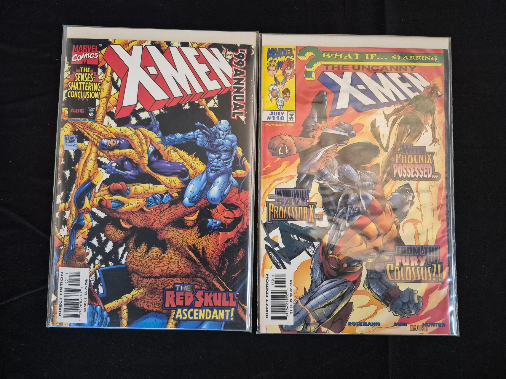 BID PER WHAT YOU SEE IN THE PHOTO, NOT THE AI GENERATED TITLES AND DESCRIPTIONS! Two Marvel Comics publications featuring characters from the X-Men franchise. The lot includes the X-Men 99 Annual (August 1999) and What If… starring The Uncanny X-Men issue number 110 (July 1998). The X-Men 99 Annual features the storyline The Red Skull Ascendant with cover art credited to Adam Kubert. What If issue number 110 depicts the story With Phoenix Possessed… From the Fury of Colossus. Both publications are Direct Edition copies and include standard Marvel Comics trade dress, barcodes, and issue numbering from the late 1990s. The comics are printed on standard comic stock with color illustrations and are housed in individual protective plastic sleeves with backing boards.
