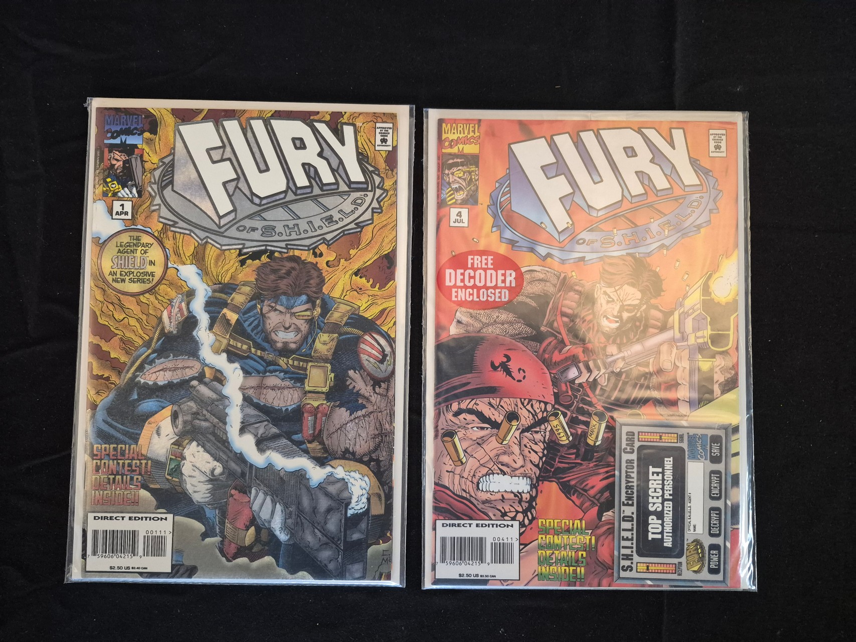 BID PER WHAT YOU SEE IN THE PHOTO, NOT THE AI GENERATED TITLES AND DESCRIPTIONS! A pair of Marvel Comics publications from the 1995 Fury of S.H.I.E.L.D. series, comprising Direct Edition issues number 1 (April) and number 4 (July). Issue number 1 features a silver foil-etched cover. Both issues display full-color cover art featuring the character Nick Fury. Issue number 4 includes a graphic for an S.H.I.E.L.D. Encryptor Card and an announcement for a free decoder. The comics include standard Marvel Comics branding, barcodes, and dual US and Canadian price markings.