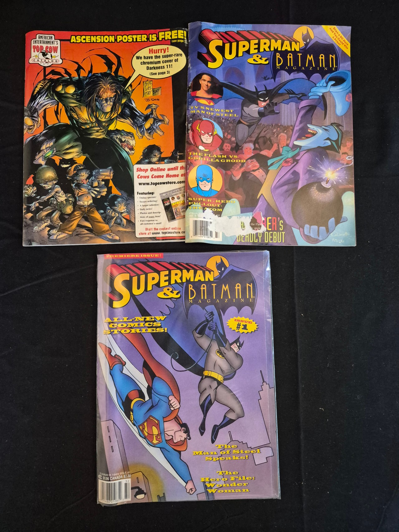 BID PER WHAT YOU SEE IN THE PHOTO, NOT THE AI GENERATED TITLES AND DESCRIPTIONS! This collection of three paper-based publications from the 1990s includes two issues of Superman & Batman Magazine published by DC Comics and one American Entertainment Top Cow Catalog. The group features the Superman & Batman Magazine Premiere Issue 1 from Summer 1993, which is currently housed in a protective plastic sleeve. The second magazine issue features cover illustrations of Batman and the Joker, with additional character callouts for The Flash and The Atom, as well as a photographic inset of actor Dean Cain. The Top Cow Catalog features cover art related to the series The Darkness. These publications contain various illustrations, promotional materials, and comic-related content from the era.