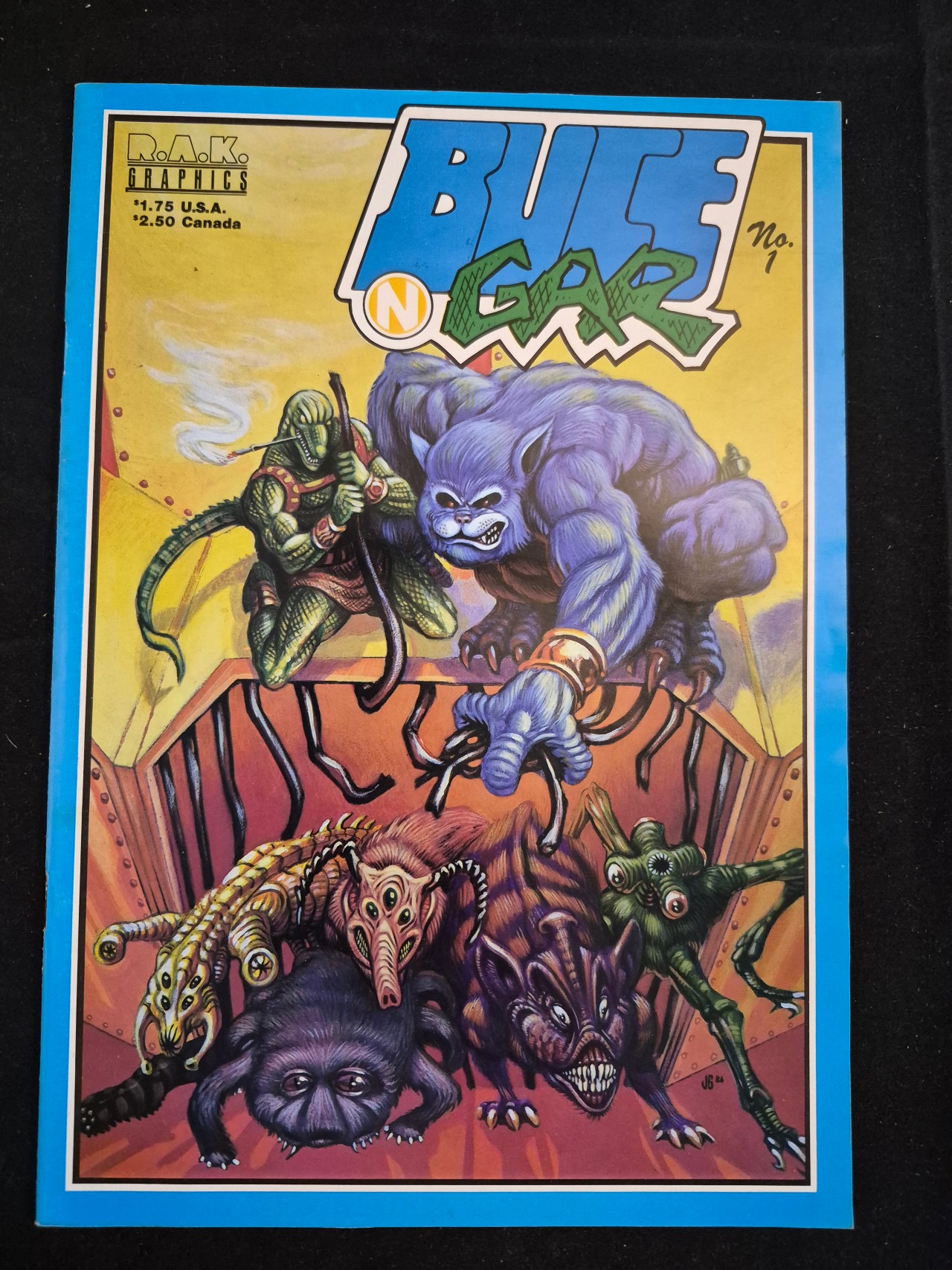 BID PER WHAT YOU SEE IN THE PHOTO, NOT THE AI GENERATED TITLES AND DESCRIPTIONS! Buce N Gar issue number 1, published by R.A.K. Graphics in December 1986. This comic book features cover artwork signed JS 86, attributed to artist Jim Groman. The illustration depicts a group of science fiction and fantasy creatures, including a smoking anthropomorphic lizard and a large, muscular purple feline-like beast, with several smaller monstrous entities positioned below them. The cover includes the title Buce N Gar in stylized blue and green lettering, the issue designation No. 1, and original retail prices of $1.75 U.S.A. and $2.50 Canada.