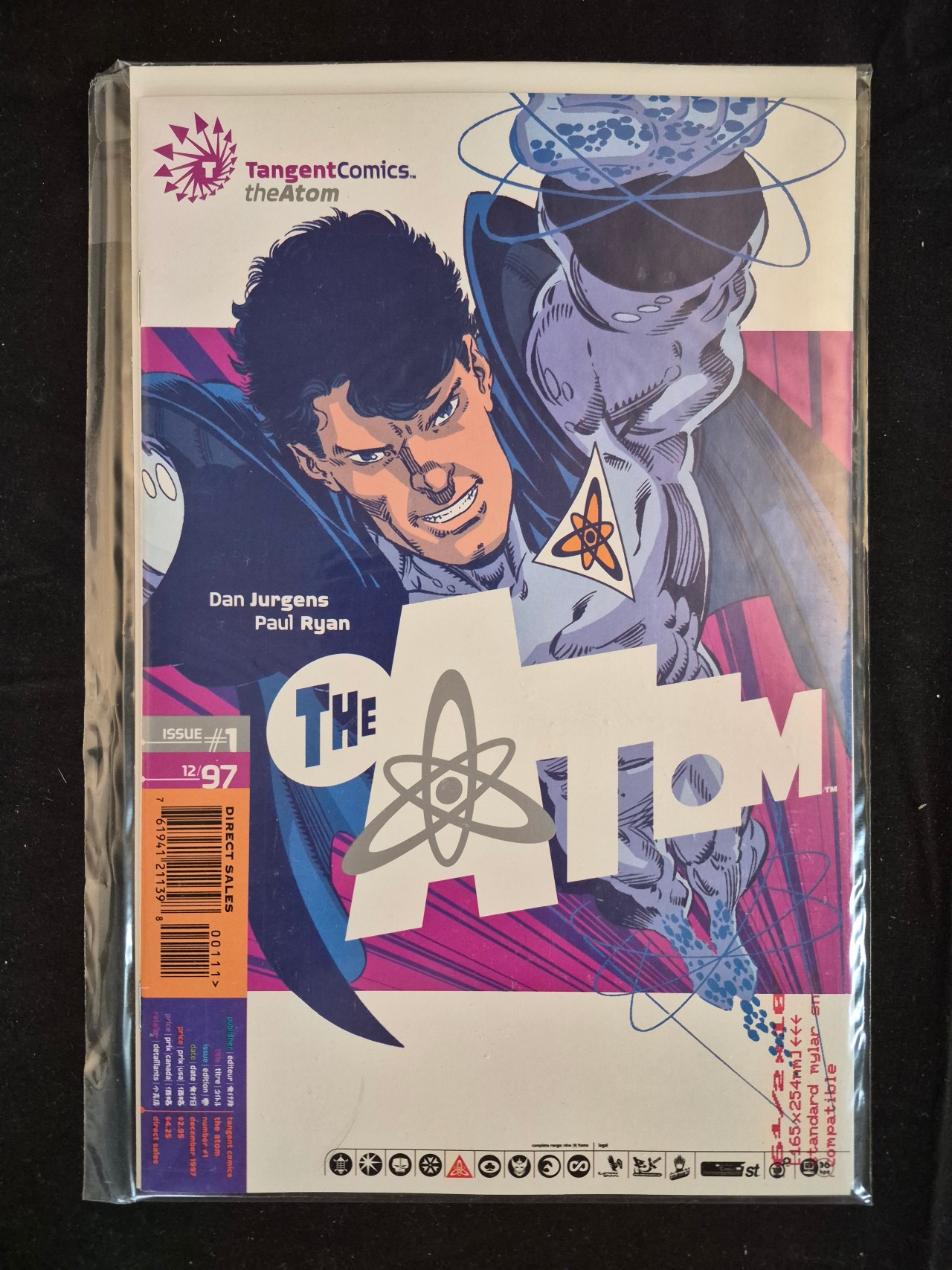 BID PER WHAT YOU SEE IN THE PHOTO, NOT THE AI GENERATED TITLES AND DESCRIPTIONS! This single-issue comic book is titled The Atom, published under the Tangent Comics imprint by DC Comics. The issue is identified as number 1 and dated December 1997. The cover art is credited to Dan Jurgens and Paul Ryan, featuring the character Adam Thompson of Earth-9. The illustration depicts a male figure in a gray suit and dark cape with an atom symbol on the chest. The title is displayed in stylized white lettering with an overlapping atomic graphic. The left margin includes a barcode, a Direct Sales designation, and pricing for US and Canadian markets. A series of small graphic icons is located along the bottom edge of the cover. The item is housed in a clear protective plastic sleeve with a backing board.