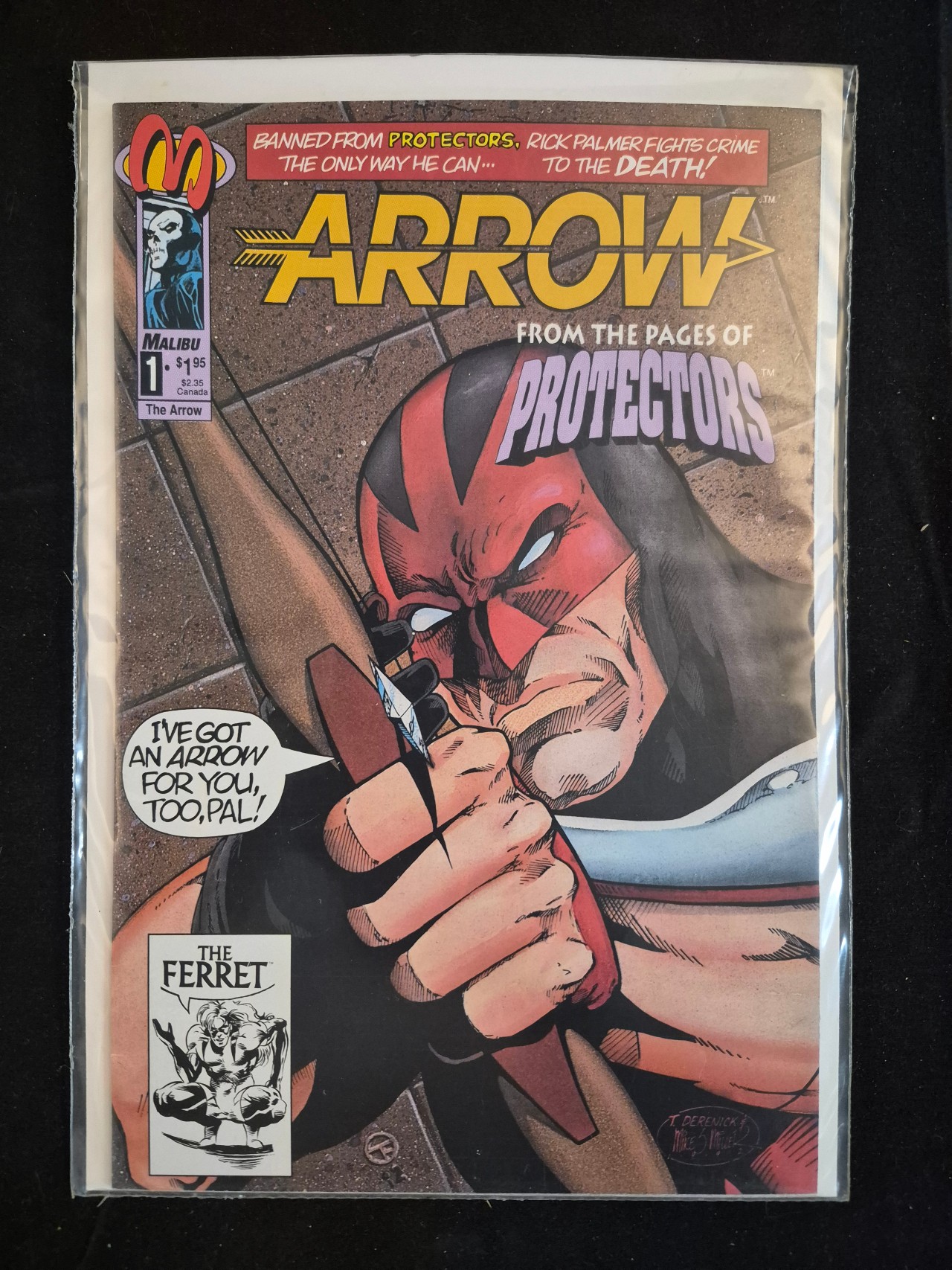BID PER WHAT YOU SEE IN THE PHOTO, NOT THE AI GENERATED TITLES AND DESCRIPTIONS! This modern-age comic book is Arrow issue number 1, published by Malibu Comics in October 1992. The cover features a stylized yellow title and the subtitle From the Pages of Protectors, centered on the character Rick Palmer. An inset in the lower-left corner features The Ferret. Artist signatures for T. Derenick and Mike S. Miller are present in the lower-right corner. The cover displays a price of $1.95 US and $2.35 Canada.