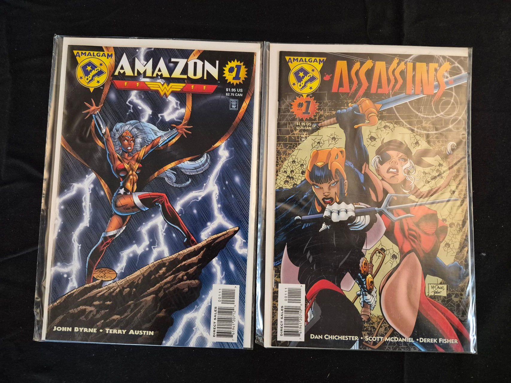 BID PER WHAT YOU SEE IN THE PHOTO, NOT THE AI GENERATED TITLES AND DESCRIPTIONS! A pair of Modern Age comic books from the Amalgam Comics imprint, published in 1996. These titles represent a crossover collaboration between DC Comics and Marvel Comics, featuring character mashups. The lot includes Amazon 1, featuring work by John Byrne and Terry Austin, and Assassins 1, by Dan Chichester, Scott McDaniel, and Derek Fisher. Amazon 1 depicts a character combining elements of Wonder Woman and Storm, while Assassins 1 features characters inspired by Elektra and Deathstroke. Each issue displays a 1.95 US cover price and includes a direct sales barcode in the lower corner. The comics are printed on standard paper stock.