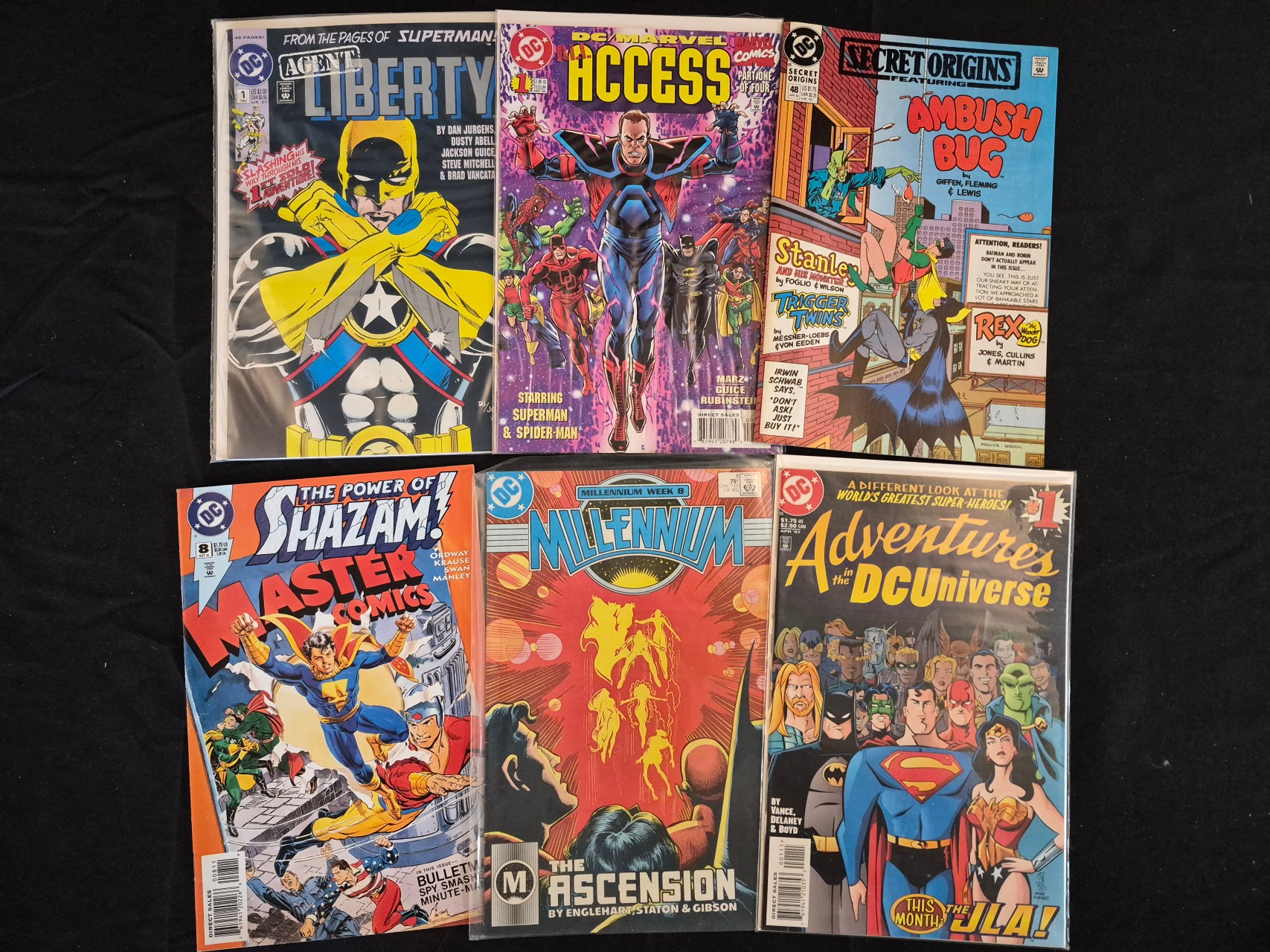 BID PER WHAT YOU SEE IN THE PHOTO, NOT THE AI GENERATED TITLES AND DESCRIPTIONS! A collection of DC comic books dating from the late 1980s through the 1990s. The assortment includes Millennium #8 (1988) by Steve Englehart and Joe Staton, which concludes the Millennium crossover event. Other titles in the group include DC/Marvel All Access #1 (1996) featuring Superman and Spider-Man, Agent Liberty #1 (1991), Secret Origins #48 featuring Ambush Bug, The Power of Shazam! Master Comics #8, and Adventures in the DC Universe #1. The publications feature full-color covers on standard comic book paper stock. Each issue is housed in a clear protective plastic sleeve.