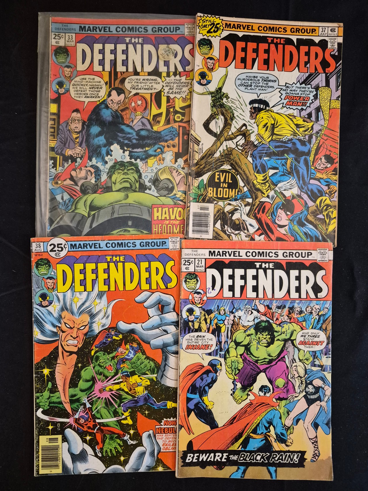 BID PER WHAT YOU SEE IN THE PHOTO, NOT THE AI GENERATED TITLES AND DESCRIPTIONS! This group of vintage American comic books features titles from the Marvel Comics Group series The Defenders, dating to the mid-1970s Bronze Age. The collection includes issues 21, 33, 37, and 38. Each publication is a staple-bound paper booklet featuring dynamic cover illustrations with the prominent The Defenders masthead and the Marvel Comics Group banner. Characters depicted on the covers include the Hulk, Doctor Strange, Valkyrie, Nighthawk, and Power Man. The covers display issue numbers, monthly designations, and original price markings ranging from 25 to 37 cents.