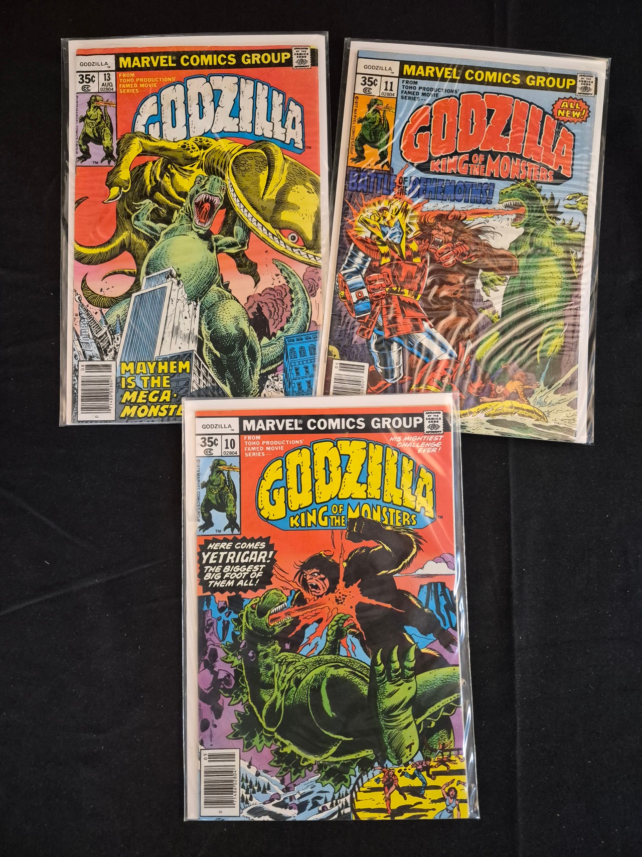 BID PER WHAT YOU SEE IN THE PHOTO, NOT THE AI GENERATED TITLES AND DESCRIPTIONS! A trio of vintage Marvel Comics Group publications featuring Godzilla, King of the Monsters. This group includes issues number 10, 11, and 13 from the series dating to the late 1970s Bronze Age. Each comic displays a 35-cent cover price, the Comics Code Authority seal, and credits to Toho Productions. The cover of issue 10 illustrates Godzilla in combat with Yetrigar, issue 11 depicts the Battle of the Behemoths, and issue 13 features a battle with a mega-monster. The items are constructed of newsprint with color-printed covers and are individually stored in clear plastic sleeves with white backing boards.