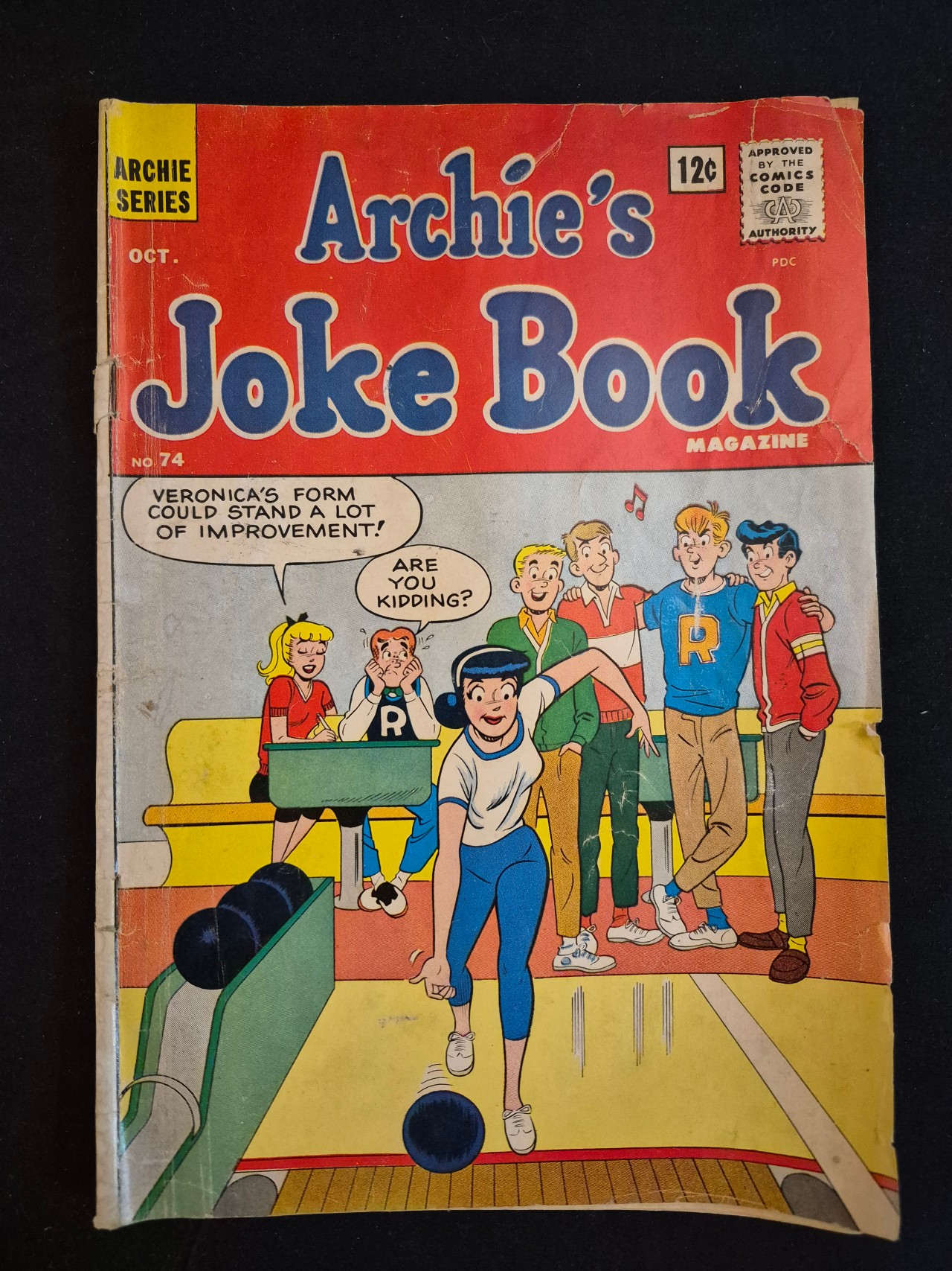 BID PER WHAT YOU SEE IN THE PHOTO, NOT THE AI GENERATED TITLES AND DESCRIPTIONS! Archie’s Joke Book Magazine, Issue No. 74, published as part of the Archie Series in October 1963. The color illustrated cover depicts characters from the Archie universe at a bowling alley with integrated speech bubbles. The front cover features the Approved by the Comics Code Authority seal, the PDC distributor mark, and an original 12-cent price point. This Silver Age publication is constructed of printed paper.