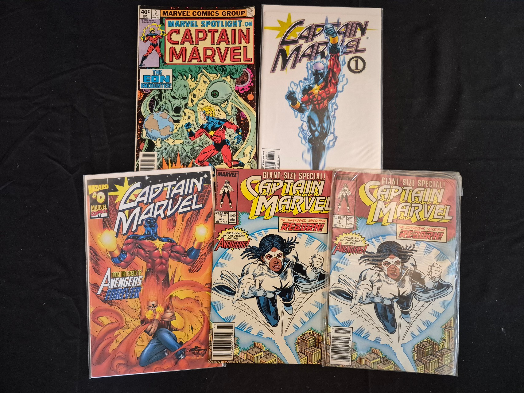 BID PER WHAT YOU SEE IN THE PHOTO, NOT THE AI GENERATED TITLES AND DESCRIPTIONS! A collection of Marvel comic books featuring the character Captain Marvel, spanning from the late 1970s to the 1990s. The group includes Marvel Spotlight on Captain Marvel number 3 (1979), a modern Captain Marvel number 1, a Captain Marvel number 0 Wizard special, and two copies of Captain Marvel Giant-Size Special! number 1. The issues are printed on standard comic stock and feature cover taglines including The Eon Encounter! and Reborn!. Visible price points on the covers range from 40 cents to 1.50 dollars.