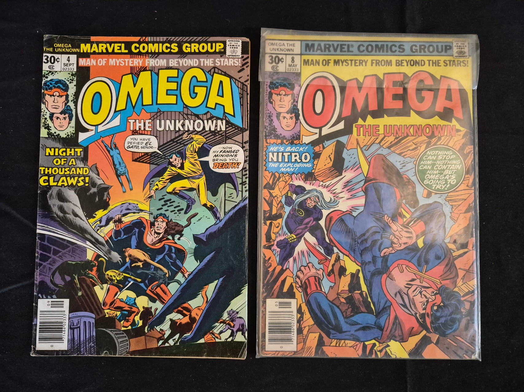 BID PER WHAT YOU SEE IN THE PHOTO, NOT THE AI GENERATED TITLES AND DESCRIPTIONS! This pair of Bronze Age comic books published by Marvel Comics Group features issues of Omega the Unknown. The lot includes issue number 4, dated September, and issue number 8, dated May. Both publications date from the mid-1970s and display a 30-cent cover price and the Comics Code Authority seal. The color-printed covers identify the protagonist as the Man of Mystery from Beyond the Stars. Issue number 4 includes the caption Night of a Thousand Claws! and issue number 8 features Nitro the Exploding Man. Both covers include standard UPC barcodes. One comic book is presented in a clear plastic protective sleeve.