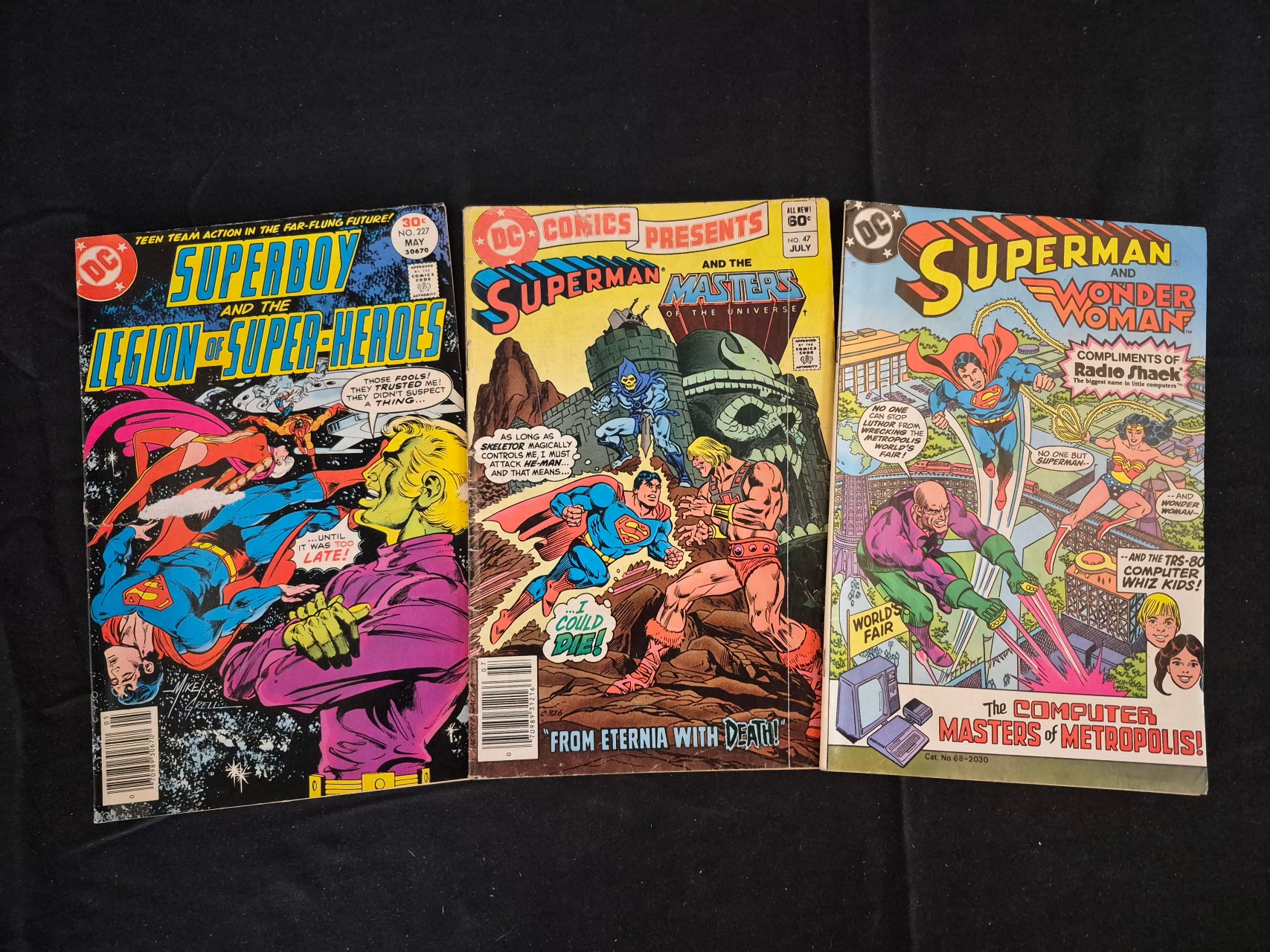 BID PER WHAT YOU SEE IN THE PHOTO, NOT THE AI GENERATED TITLES AND DESCRIPTIONS! A trio of vintage DC comic books dating from the late 1970s and early 1980s. The lot includes Superboy and the Legion of Super-Heroes No. 227 (May 1977), DC Comics Presents No. 47 (July 1982) featuring Superman and the Masters of the Universe, and a promotional giveaway titled Superman and Wonder Woman: The Computer Masters of Metropolis! produced for Radio Shack (1982). These Bronze Age publications are constructed with staple-bound paper covers and newsprint interiors. The covers display original trade dress including the DC bullet logo, price markings, and issue numbers. DC Comics Presents No. 47 is noted for the crossover appearance of He-Man and Skeletor. The Radio Shack promotional issue features the TRS-80 Computer Whiz Kids alongside Superman and Wonder Woman.