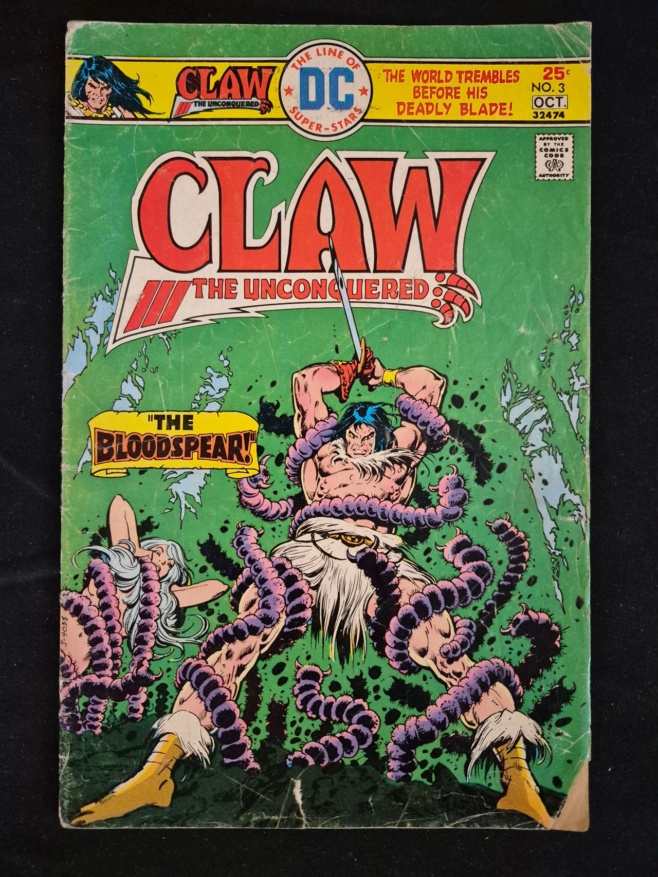 BID PER WHAT YOU SEE IN THE PHOTO, NOT THE AI GENERATED TITLES AND DESCRIPTIONS! This is a single comic book, Claw the Unconquered No. 3, published by DC Comics with an October 1975 cover date. This Bronze Age publication is part of the Line of DC Super-Stars series. The front cover features a 25-cent price point and the Comics Code Authority seal. The cover art, attributed to Ernie Chan, depicts a barbarian protagonist and a companion engaged in combat with purple tentacled monsters, illustrating the story titled The Bloodspear!. The issue is identified as Vol. 1, No. 3, with the numeric code 32474 printed on the top right.