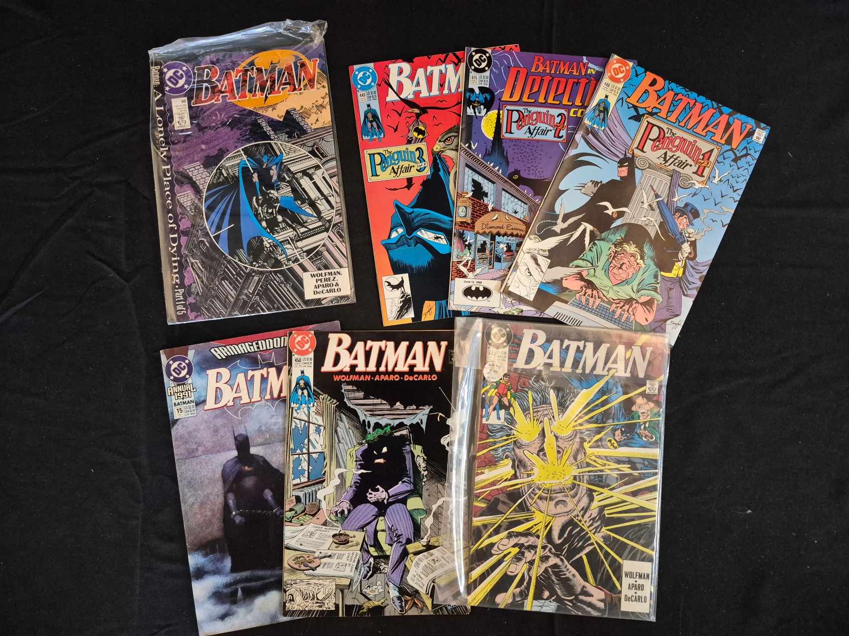 BID PER WHAT YOU SEE IN THE PHOTO, NOT THE AI GENERATED TITLES AND DESCRIPTIONS! A collection of DC Comics featuring Batman and Detective Comics titles, primarily published between 1989 and 1991. The group includes Batman issue 440 (October 1989), which features the first part of the A Lonely Place of Dying story arc. Other notable issues include selections from The Penguin Affair crossover across Batman and Detective Comics, and the 1991 Batman Annual 15 associated with the Armageddon 2001 event. Creators credited on the covers include Marv Wolfman, George Perez, Jim Aparo, and Mike DeCarlo. The comics are standard monthly format with illustrated paper covers.