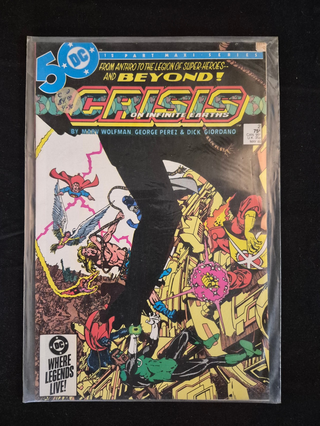 BID PER WHAT YOU SEE IN THE PHOTO, NOT THE AI GENERATED TITLES AND DESCRIPTIONS! This is a single issue of the DC Comics twelve-part maxi-series Crisis on Infinite Earths, specifically issue number 2, dated May 1985. The publication features the work of writer Marv Wolfman and artists George Perez and Dick Giordano. The front cover displays the DC 50th-anniversary logo, the issue number, and the original 75-cent retail price. The cover illustration depicts a dynamic scene with characters including Superman, Green Lantern, and Dawnstar. This issue is noted in the market for the first cameo appearance of the Anti-Monitor. The comic is housed in a clear plastic protective sleeve. A circular price sticker is affixed to the upper left corner of the front cover.