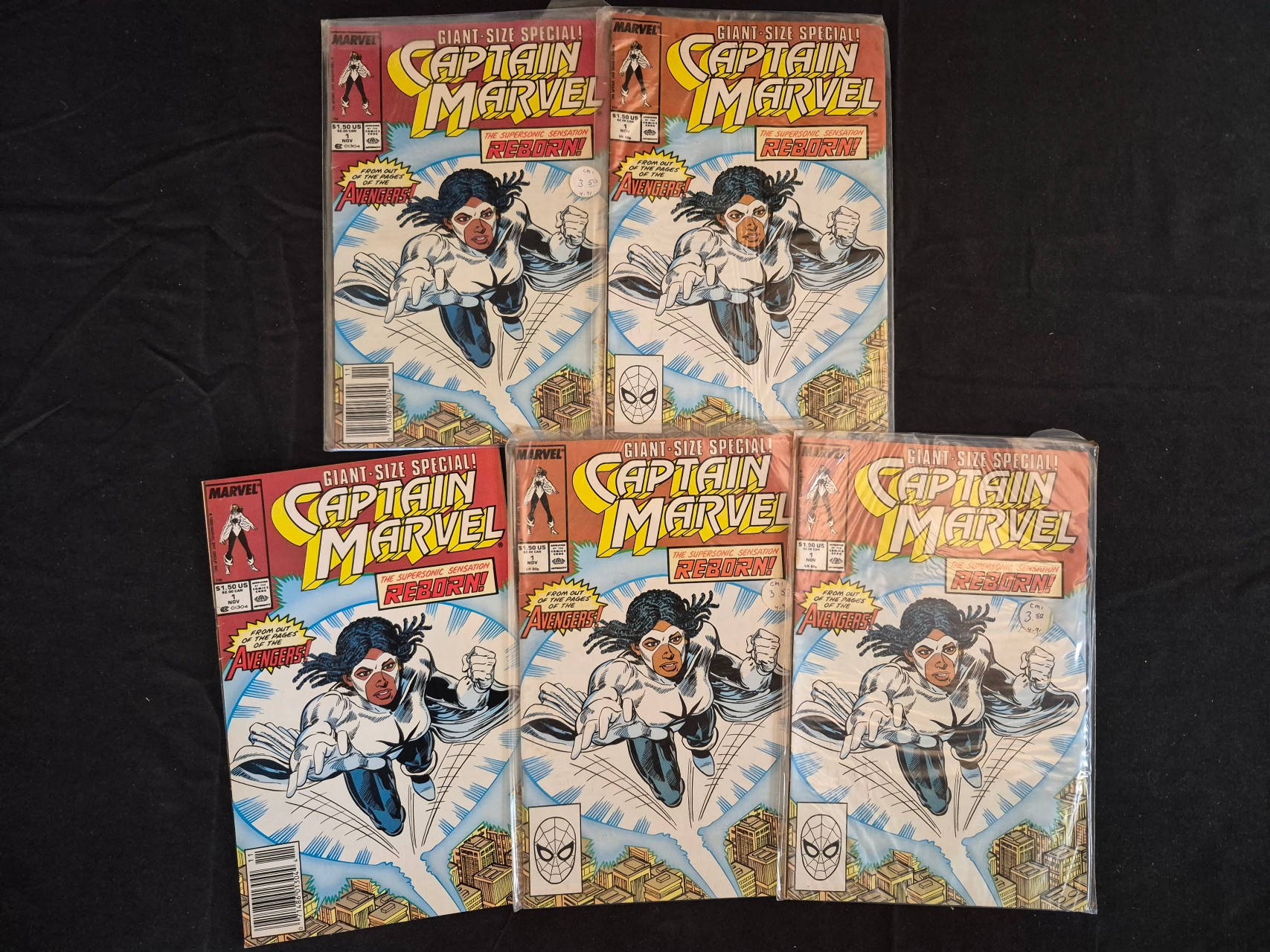 BID PER WHAT YOU SEE IN THE PHOTO, NOT THE AI GENERATED TITLES AND DESCRIPTIONS! A group of Marvel Comics Captain Marvel Vol. 2 #1 Giant-Size Special periodicals, dated 1989. These issues feature the Monica Rambeau iteration of the character and are subtitled Reborn!. The cover illustrations depict the character in a white and black costume flying above a city skyline, accompanied by the text The Supersonic Sensation Reborn! and From out of the pages of the Avengers!. The printed cover price is $1.50 US. The group contains both newsstand editions with barcodes and direct market editions featuring the Spider-Man icon in the UPC area. The items are paper-bound and most are housed in clear plastic protective sleeves.