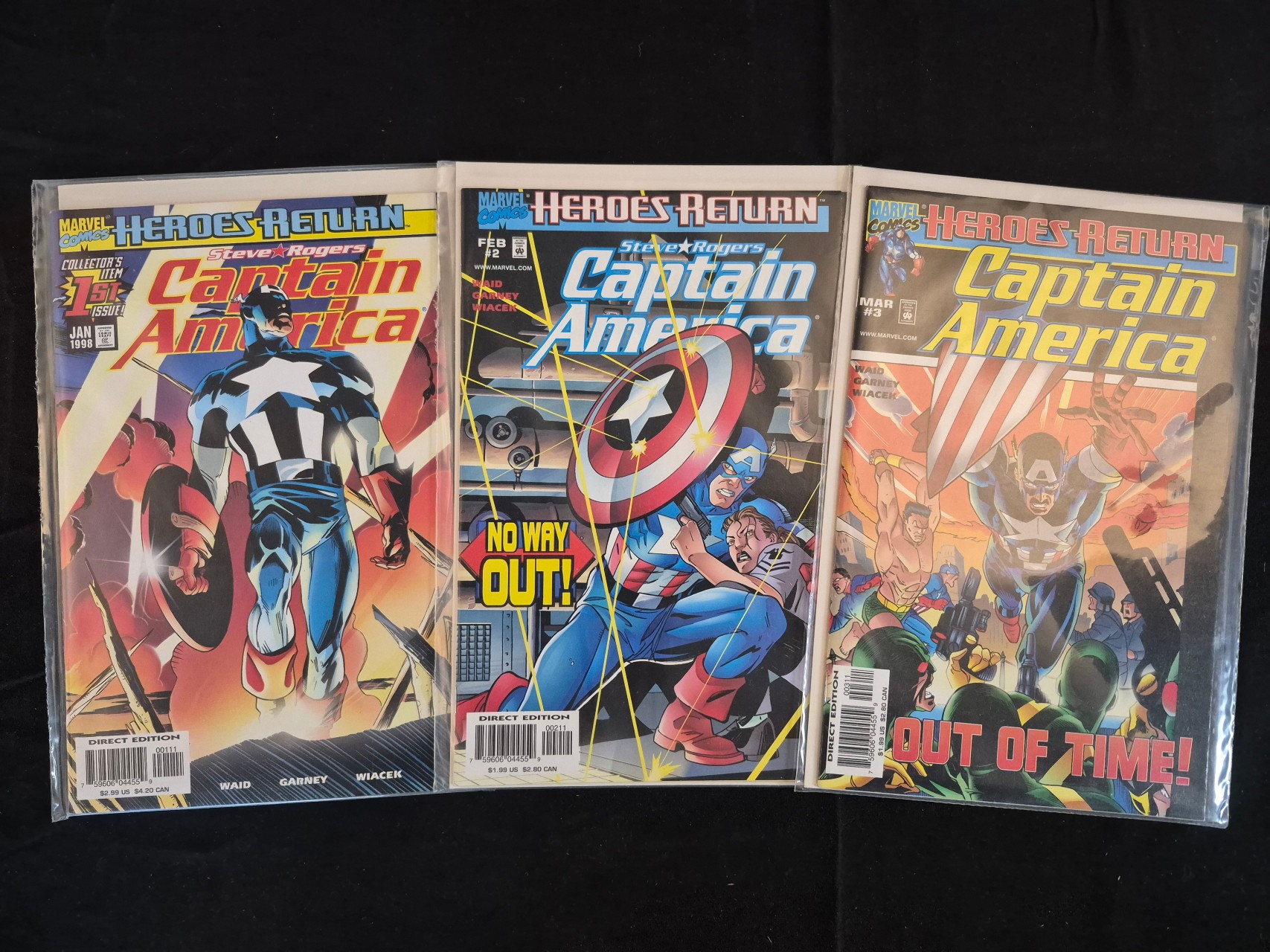 BID PER WHAT YOU SEE IN THE PHOTO, NOT THE AI GENERATED TITLES AND DESCRIPTIONS! A trio of Marvel Comics Captain America Volume 3 comic books from the Heroes Return relaunch. The collection includes issue number 1 dated January 1998, issue number 2 dated February 1998, and issue number 3 dated March 1998. These direct edition publications feature the work of writer Mark Waid, artist Ron Garney, and inker Bob Wiacek. Issue number 1 is identified on the cover as a Collector’s Item 1st Issue. Issue number 2 is titled NO WAY OUT! and issue number 3 is titled OUT OF TIME!. The comics are constructed with staple-bound color covers and interior pages. Each issue is individually presented in a clear protective plastic sleeve with a white cardstock backing board.