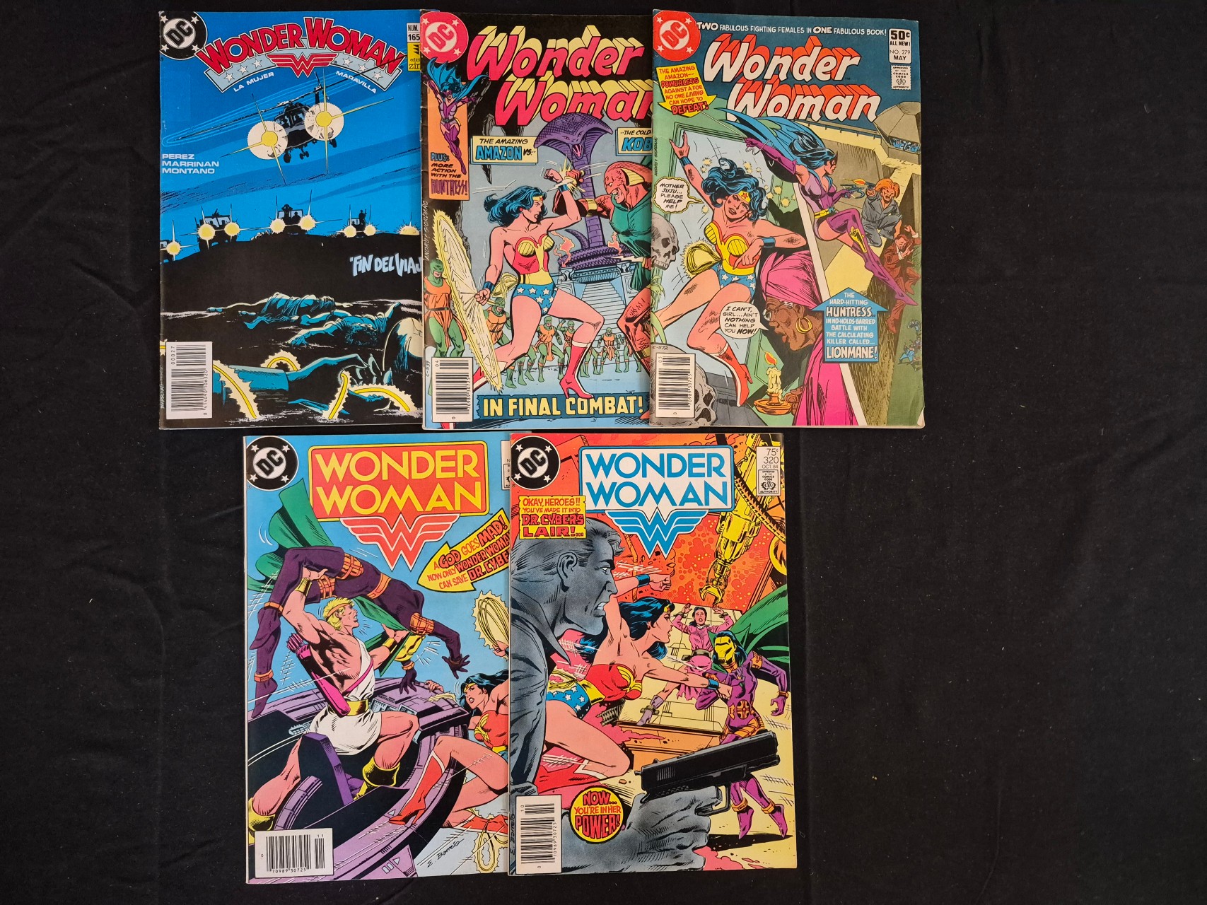 BID PER WHAT YOU SEE IN THE PHOTO, NOT THE AI GENERATED TITLES AND DESCRIPTIONS! A group of DC Comics Wonder Woman comic books from the late Bronze Age and early Modern Age. The lot includes issue numbers 165, 279, 309, 320, and 321. Issue 165 is a Spanish language variant titled La Mujer Maravilla and Fin del Viaje, with cover credits for Perez, Marrinan, and Montano. Issue 321, published in 1984, features characters Princess Diana, the Amazons, and Dr. Cyber. These are staple-bound paper publications with cover prices ranging from 50 cents to 1.00 dollar.