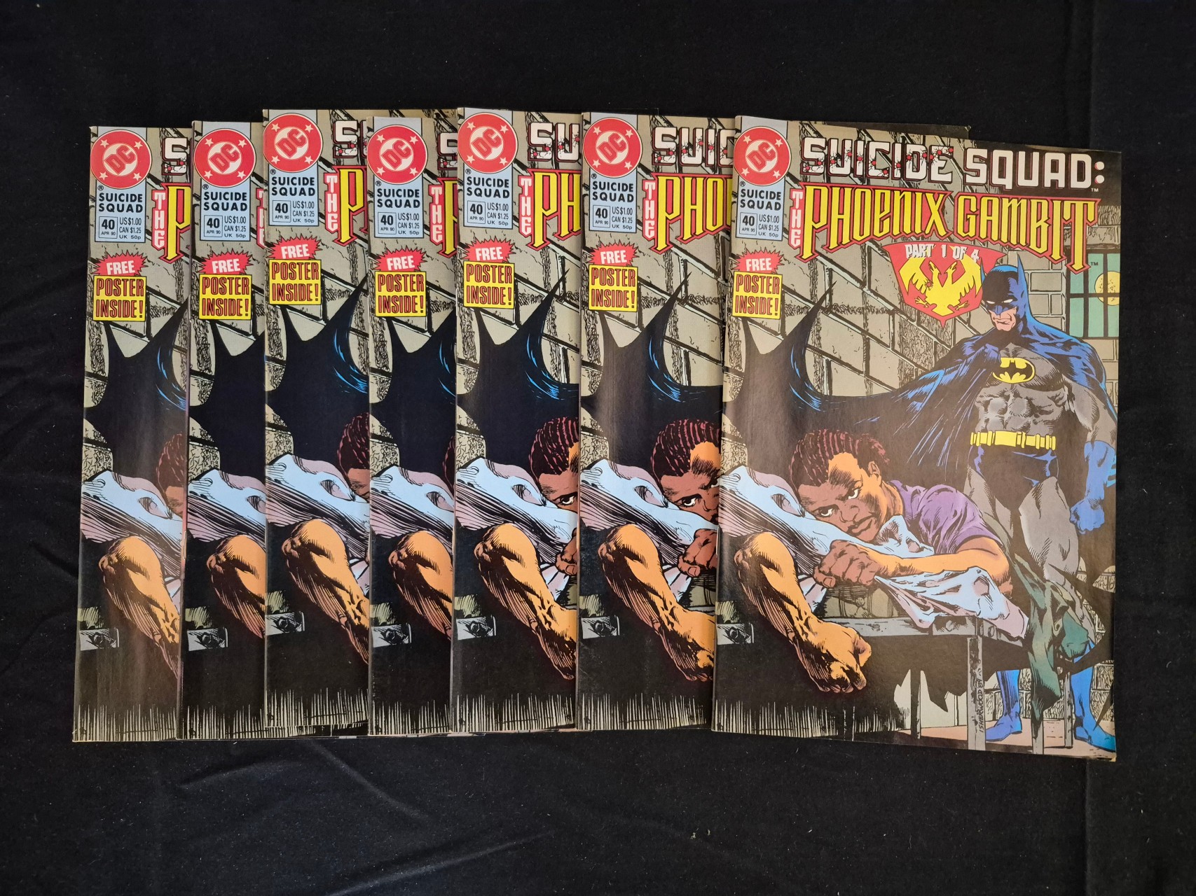 BID PER WHAT YOU SEE IN THE PHOTO, NOT THE AI GENERATED TITLES AND DESCRIPTIONS! A collection of DC comic books featuring Suicide Squad issue number 40, titled The Phoenix Gambit, Part 1 of 4, dated April 1990. Each issue features cover art depicting Batman standing over a character in a prison cell. The masthead includes the circular DC logo, the issue number, and the original retail price of US $1.00. A promotional banner on the cover states FREE POSTER INSIDE. The issues are printed on standard comic book paper with color illustrations.