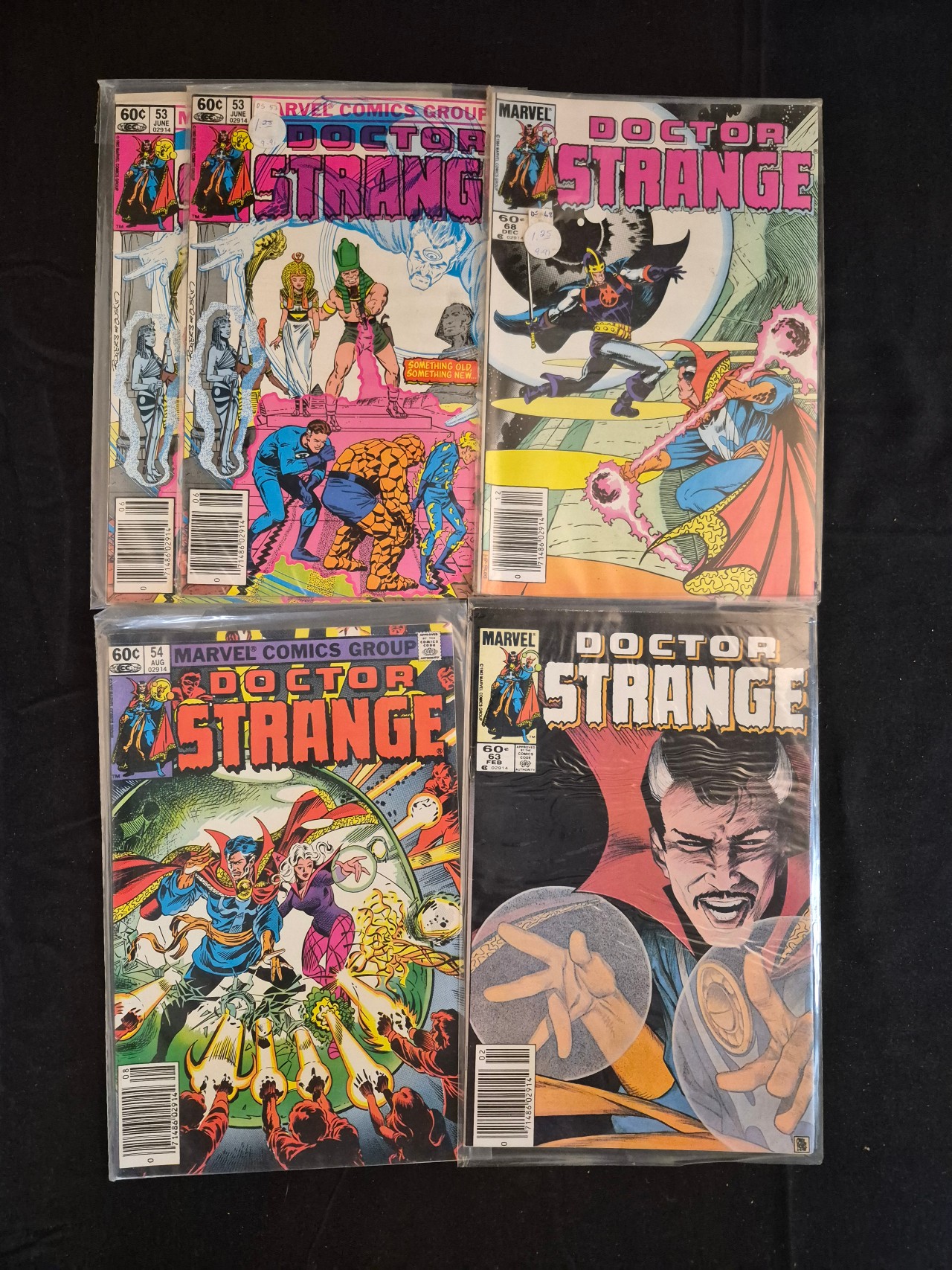 BID PER WHAT YOU SEE IN THE PHOTO, NOT THE AI GENERATED TITLES AND DESCRIPTIONS! This collection of vintage American comic books features several issues of the Doctor Strange title published by Marvel Comics Group. The issues date from the early 1980s and include numbers 53, 54, 63, and 68. Each book is printed on standard paper stock and displays a 60-cent cover price. The cover illustrations feature the Doctor Strange masthead and various characters including the Fantastic Four. The items are housed in clear plastic protective sleeves.