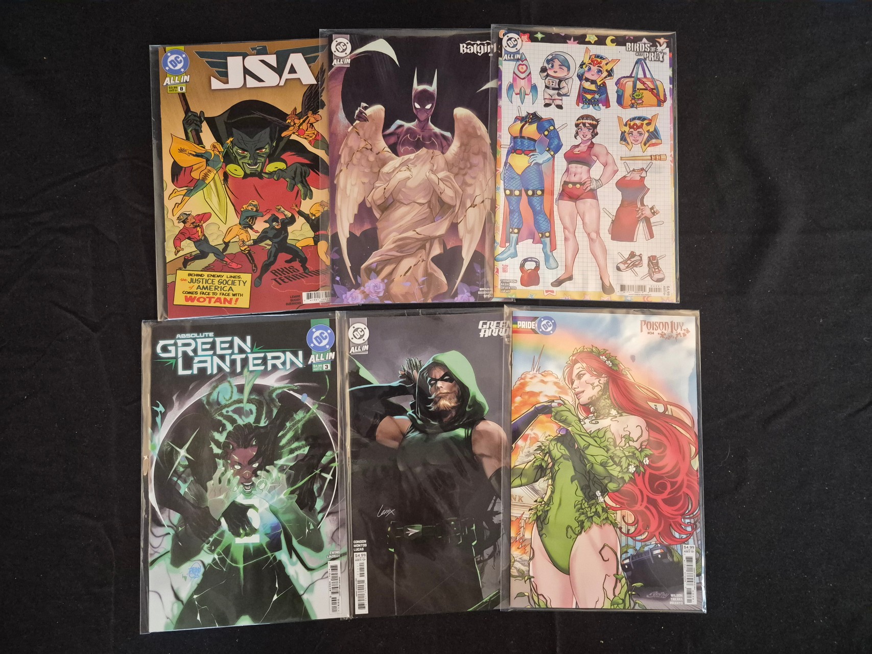 BID PER WHAT YOU SEE IN THE PHOTO, NOT THE AI GENERATED TITLES AND DESCRIPTIONS! This collection of modern-era American comic books published by DC Comics features titles such as JSA, Batgirl, Birds of Prey, Absolute Green Lantern, Green Arrow, and Poison Ivy. A notable inclusion is Poison Ivy #34 Cover D, the Betsy Cola DC Pride Connecting Card Stock Variant. Several issues, including JSA, Batgirl, Birds of Prey, Absolute Green Lantern, and Green Arrow, feature the DC ALL IN branding on the covers. The comics are printed on glossy paper and are individually housed in protective transparent plastic sleeves with cardboard backing boards. Visible cover prices include $3.99 and $4.99, accompanied by standard retail barcodes. The artwork represents contemporary graphic styles associated with the respective series.