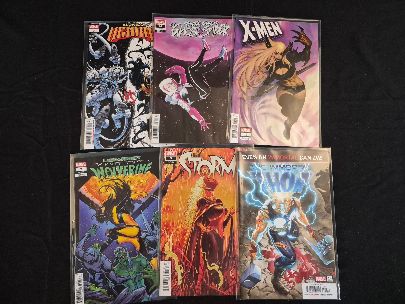 BID PER WHAT YOU SEE IN THE PHOTO, NOT THE AI GENERATED TITLES AND DESCRIPTIONS! A collection of modern age Marvel comic books featuring high-gloss covers and standard trade dress. The group includes X-Men 17 featuring the Puppeteer Lee Magik variant cover, Spider-Gwen: Ghost-Spider 14, All-New Venom 7, Laura Kinney Wolverine 7 Variant Edition, Storm 9 Variant Edition, and The Immortal Thor 24. Each issue displays the Marvel logo, issue numbers, creative team credits, and barcodes with original retail pricing between 3.99 and 4.99 US dollars. The comics are printed on standard comic stock with contemporary superhero illustrations.