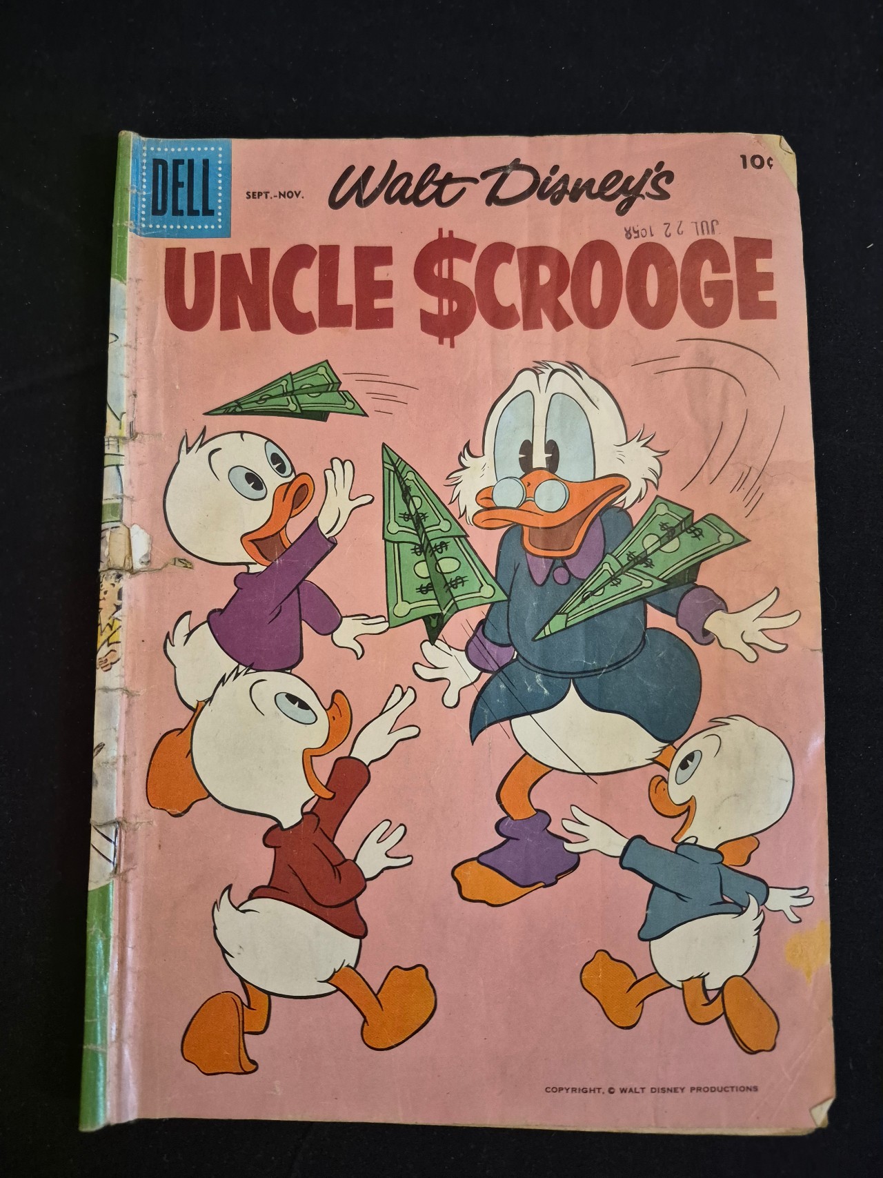 BID PER WHAT YOU SEE IN THE PHOTO, NOT THE AI GENERATED TITLES AND DESCRIPTIONS! Dell Walt Disney’s Uncle Scrooge #23, published in 1958 with cover art and interior stories by Carl Barks. This mid-century American comic book features a 10-cent cover price and a printed date range of SEPT.-NOV. The front cover displays a purple ink date stamp reading JUL 22 1958. The illustration shows Uncle Scrooge throwing paper airplanes made from currency to Huey, Dewey, and Louie. The publication is a standard format softcover comic.