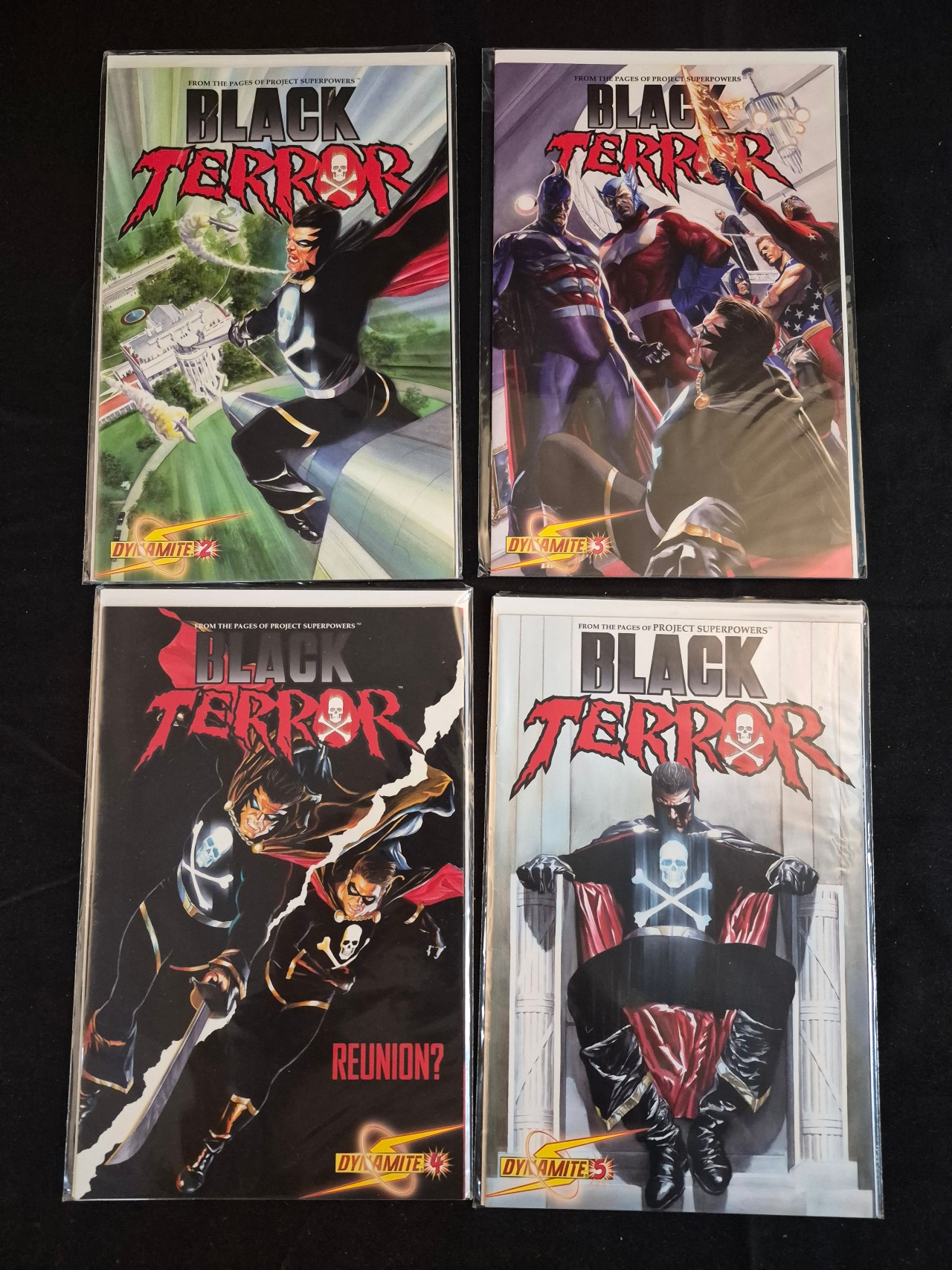 BID PER WHAT YOU SEE IN THE PHOTO, NOT THE AI GENERATED TITLES AND DESCRIPTIONS! A group of modern-era comic books from the Black Terror series, published by Dynamite Entertainment as part of the Project Superpowers franchise. The group includes issues 2, 3, 4, and 5. Each issue features cover art depicting superhero characters in various poses. The covers display the Black Terror title in red and black stylized lettering, the Dynamite publisher logo, and the respective issue number. The comics are printed on standard paper and are individually housed in clear plastic protective sleeves.