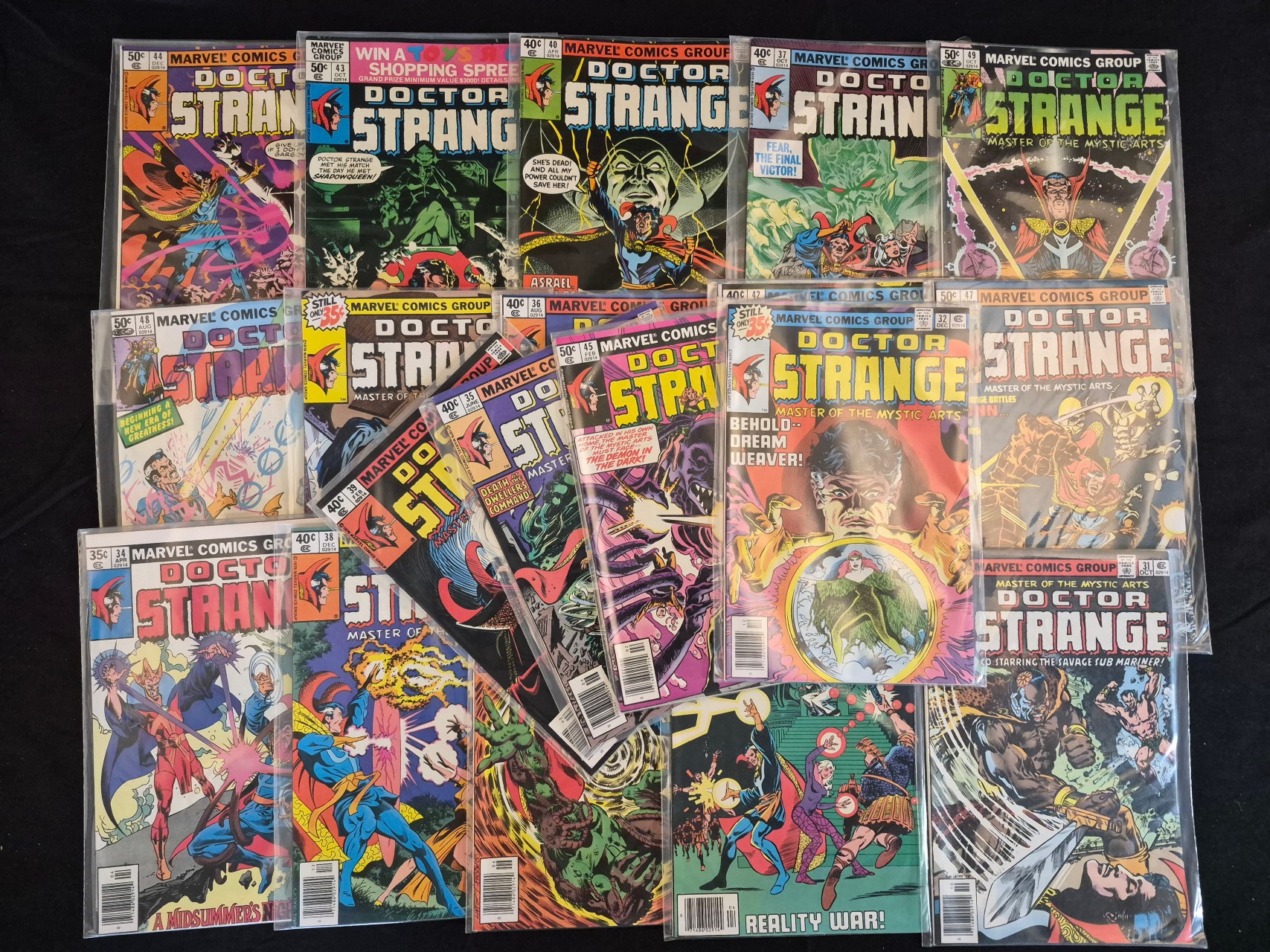 BID PER WHAT YOU SEE IN THE PHOTO, NOT THE AI GENERATED TITLES AND DESCRIPTIONS! A group of Doctor Strange Vol. 2 comic books published by Marvel Comics Group, primarily dating from the late 1970s to the early 1980s. This Bronze and Copper Age collection includes issue numbers 31, 32, 34, 35, 36, 37, 38, 39, 40, 42, 43, 44, 45, 47, 48, and 49. The comics feature multi-color cover art with original prices ranging from 35 cents to 50 cents. Each item is individually stored in a clear plastic protective sleeve. The series is subtitled Master of the Mystic Arts.